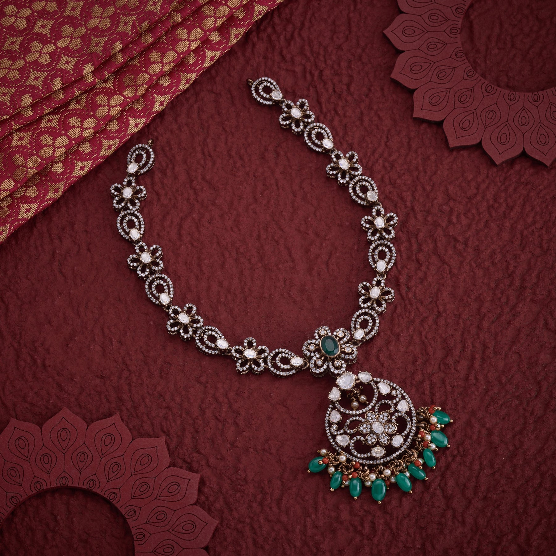 The Moissence Vilasa Short Necklace showcases intricate Floral Motifs beautifully adorned with shimmering Moissanite and Cubic Zirconia stones. A striking Emerald centerpiece is complemented by elegant Coral and Emerald drops, creating a balanced harmony of color and sparkle. This expertly crafted piece is perfect for adding a refined, sophisticated touch to any ensemble.