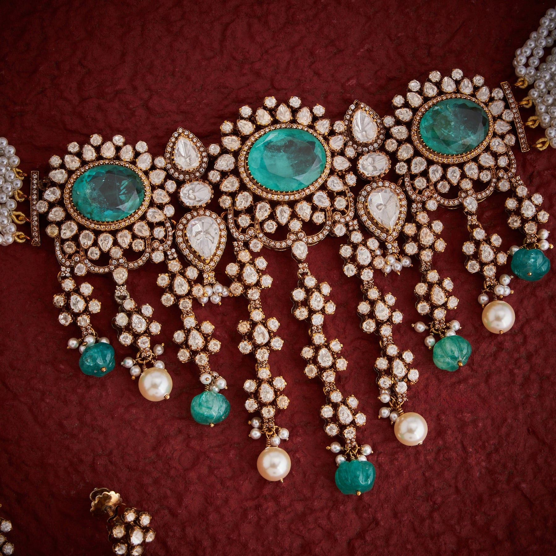 The MoissMoti Vilasa Choker Set showcases expert craftsmanship with its elegant Floral design detailed in sparkling Moissanite, Cubic Zirconia, and vibrant Emerald stones. Enhanced by delicate Pearl Beads and featuring intricately Carved Emerald and Pearl Drops, this choker set offers a refined blend of traditional artistry and contemporary elegance, perfect for making a sophisticated statement at any occasion.