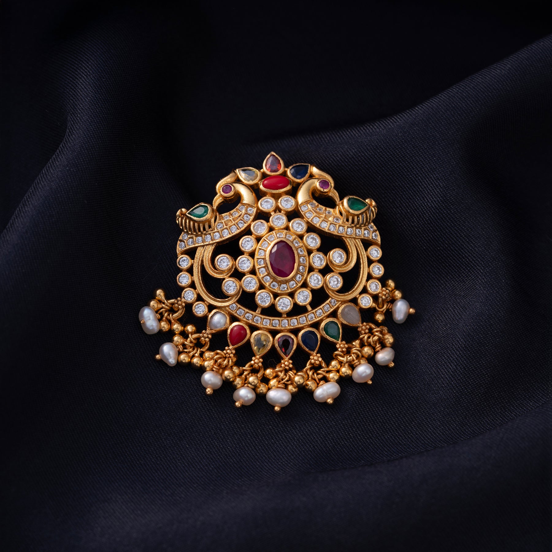 The Morfleur Pendant showcases exquisite craftsmanship featuring intricate Peacock and Floral motifs adorned with sparkling CZ stones and vibrant Navaratna gems. Enhanced by delicate hangings of Pearls and Golden beads, this pendant combines traditional elegance with refined artistry, making it a distinguished accessory for any sophisticated collection.