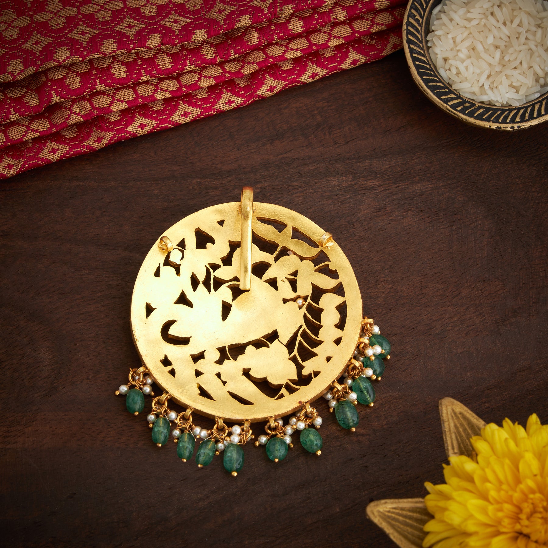 The Morikaara Pendant showcases intricate Peacock and Floral motifs, expertly crafted to highlight traditional artistry. Adorned with shimmering Kundan stones and complemented by elegant hangings of Emerald beads, this pendant brings a refined touch of regality to any ensemble. Ideal for those seeking a statement piece that blends heritage with sophistication.