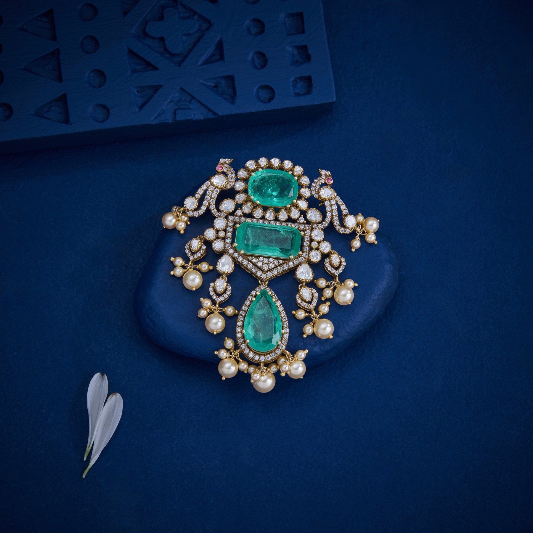 The Morivine Pendant showcases a sophisticated blend of design elements featuring Peacock, Floral, Oval, Rectangle, and Pear motifs. Expertly adorned with sparkling Cubic Zirconia and Moissanite stones, this pendant highlights a striking large Emerald centrepiece. Delicate Pearl hangings add an elegant finishing touch, making it a refined statement piece that balances intricate craftsmanship with luxurious appeal.
