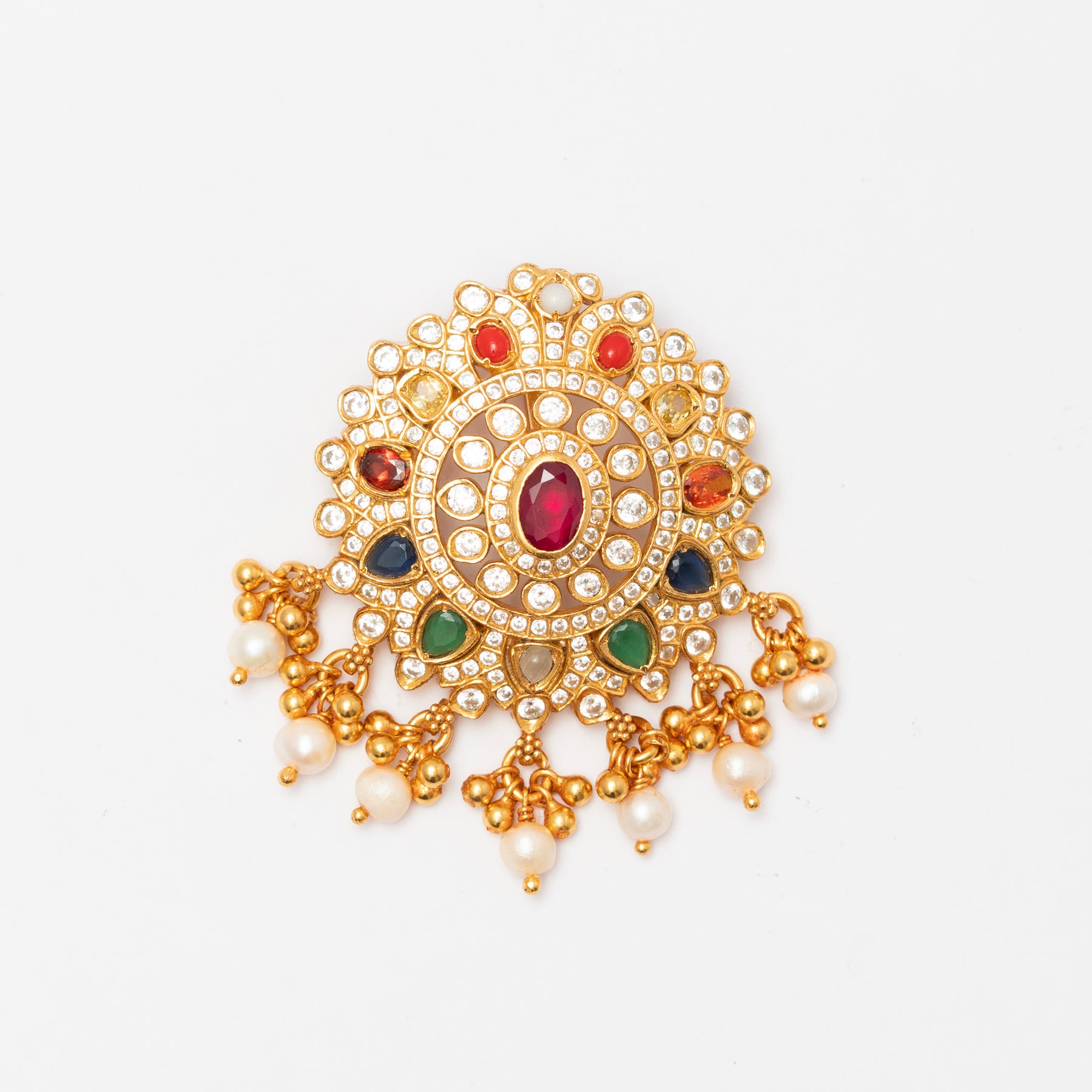 This pendant features a beautiful Floral design adorned with Navaratna and CZ stones, complemented by delicate Pearl and Golden Hangings. Crafted with precision and attention to detail, this token pendant is sure to add a touch of elegance to any outfit.