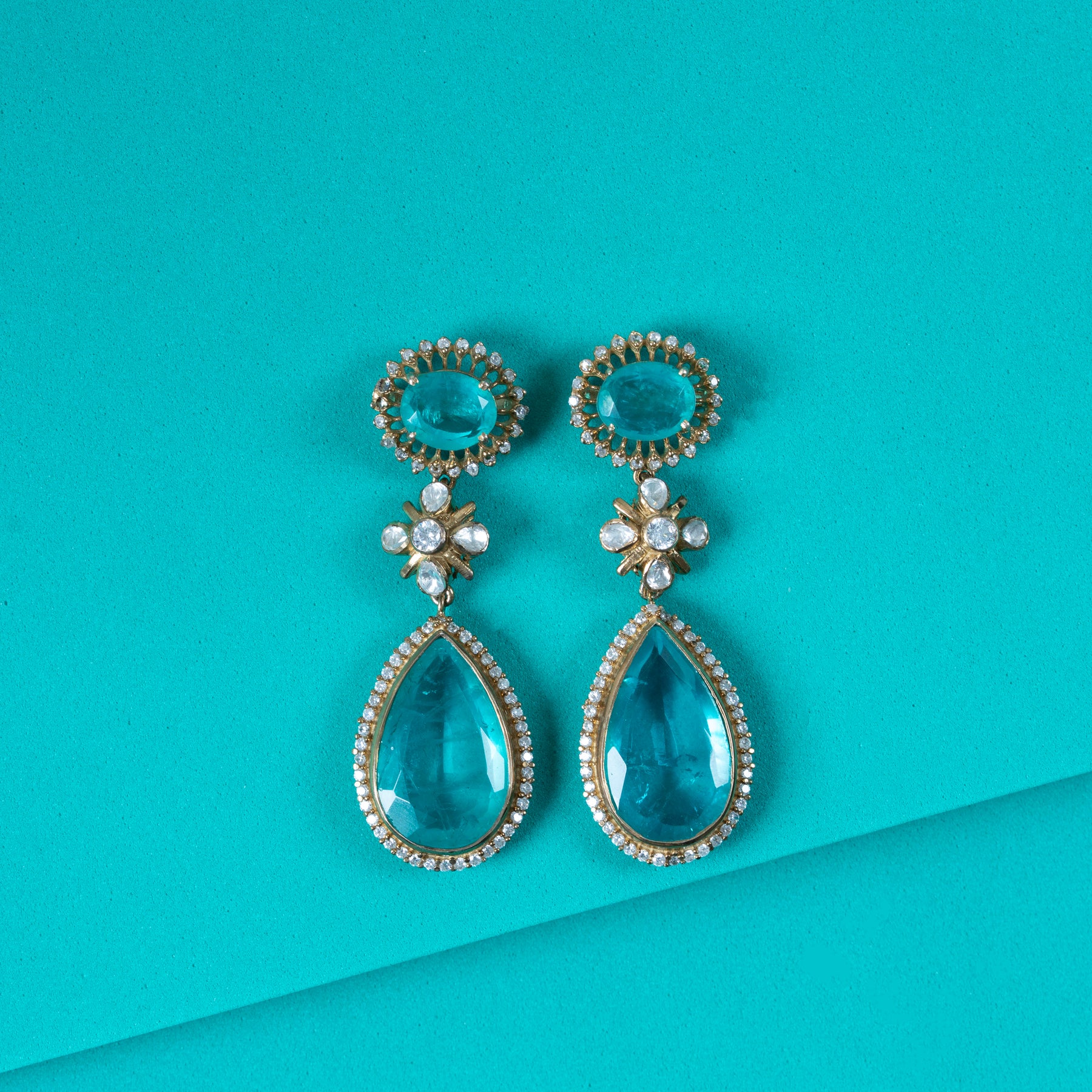 The Oceanis Bloom Danglers feature a sophisticated design that combines Pear and Oval shapes, expertly set with exquisite emerald, sparkling Cubic Zirconia (CZ) stones, and brilliant Moissanite. This elegant combination offers a refined sparkle and vibrant colour, perfect for enhancing any ensemble with a touch of timeless luxury. Ideal for those seeking a delicate yet striking accessory that reflects both craftsmanship and style.