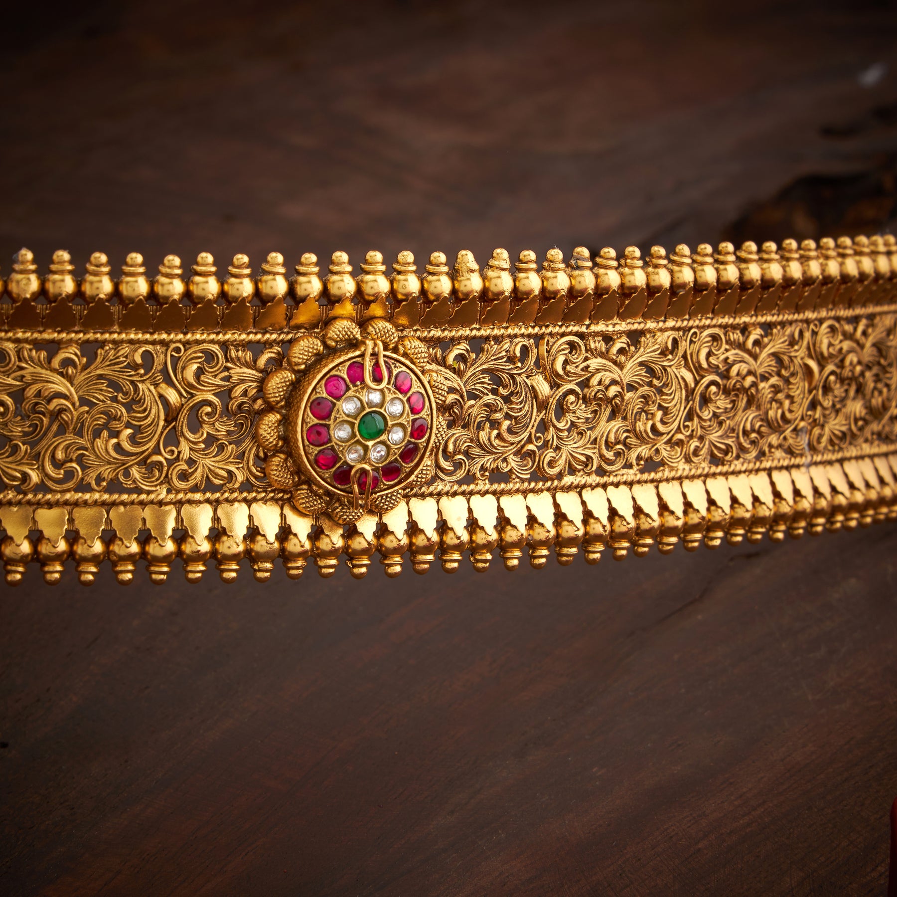 The Pallavi Mayur Oddiyanam showcases intricate Peacock and Floral motifs, exquisitely crafted with traditional Kundan work. Enhanced by delicate Golden Bead hangings, this waist belt combines elegance and cultural heritage, making it a refined accessory for traditional occasions. Its detailed artistry highlights expert craftsmanship, elevating any ethnic ensemble with timeless charm.