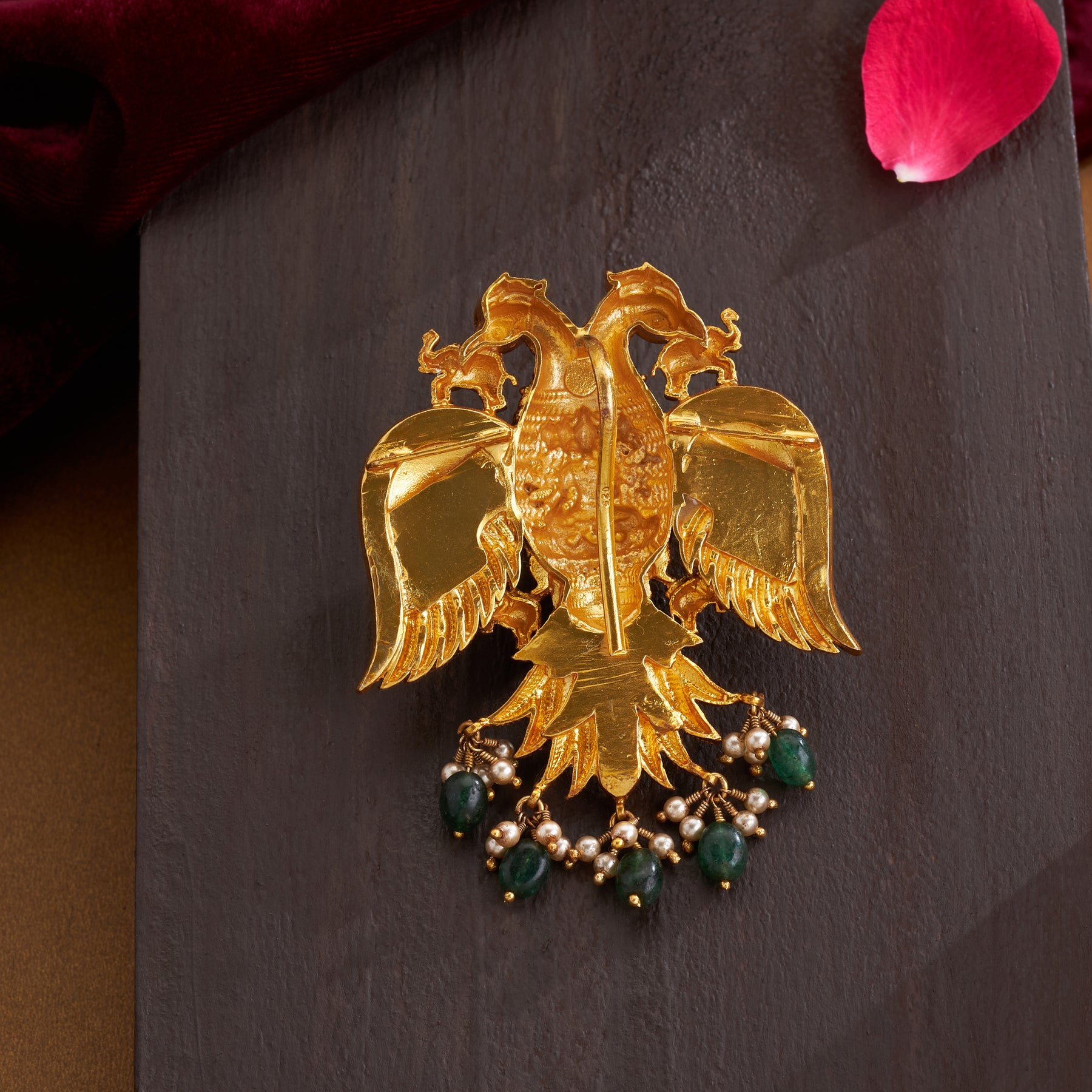The Shakti Paksha Pendant features a refined design combining the divine Lakshmi and the mythical Gandaberunda, enriched with elegant Elephant Motifs. Set with Kundan Emeralds and Rubies, it is complemented by graceful Emerald and Pearl hangings, reflecting expert craftsmanship and deep symbolic meaning in a sophisticated, timeless piece.