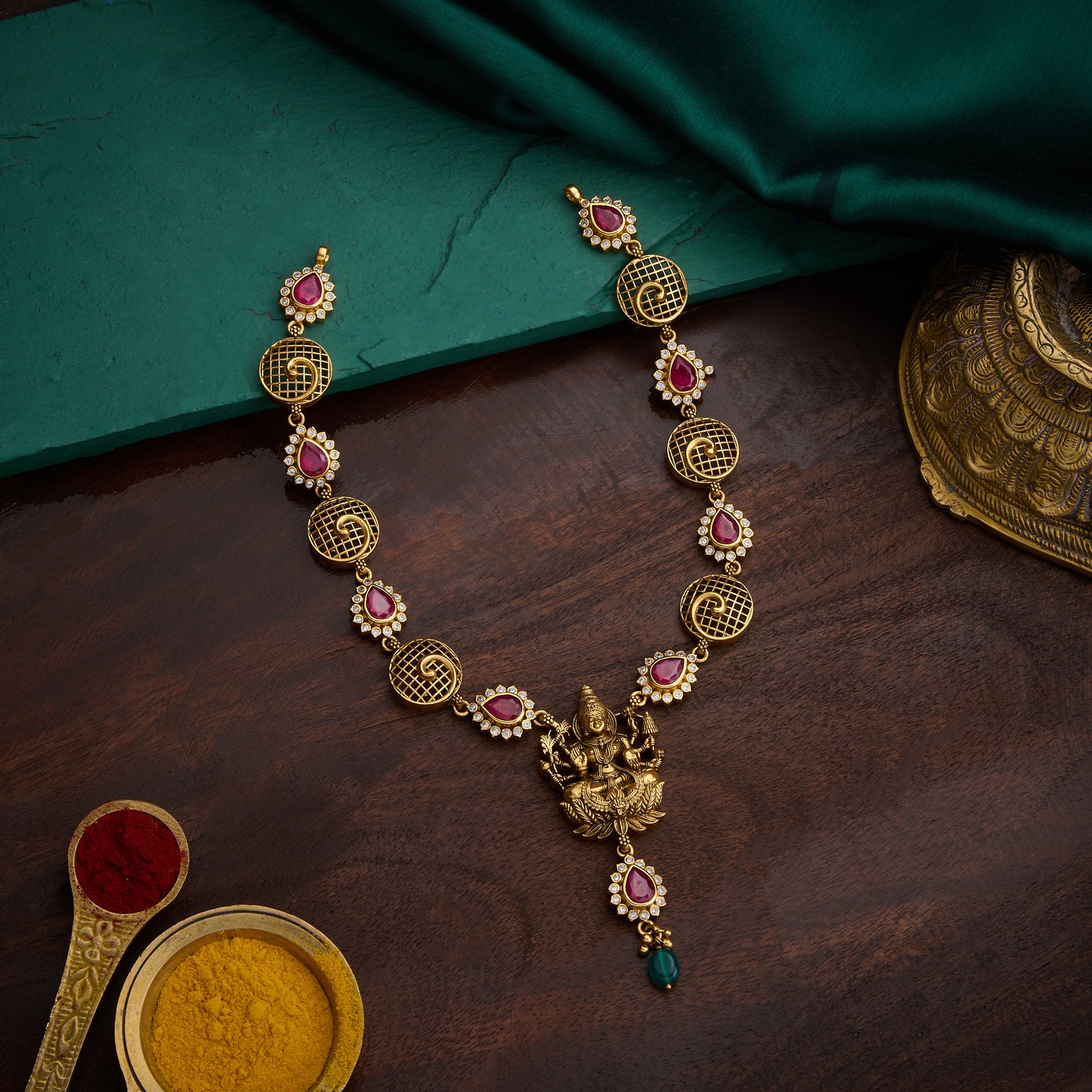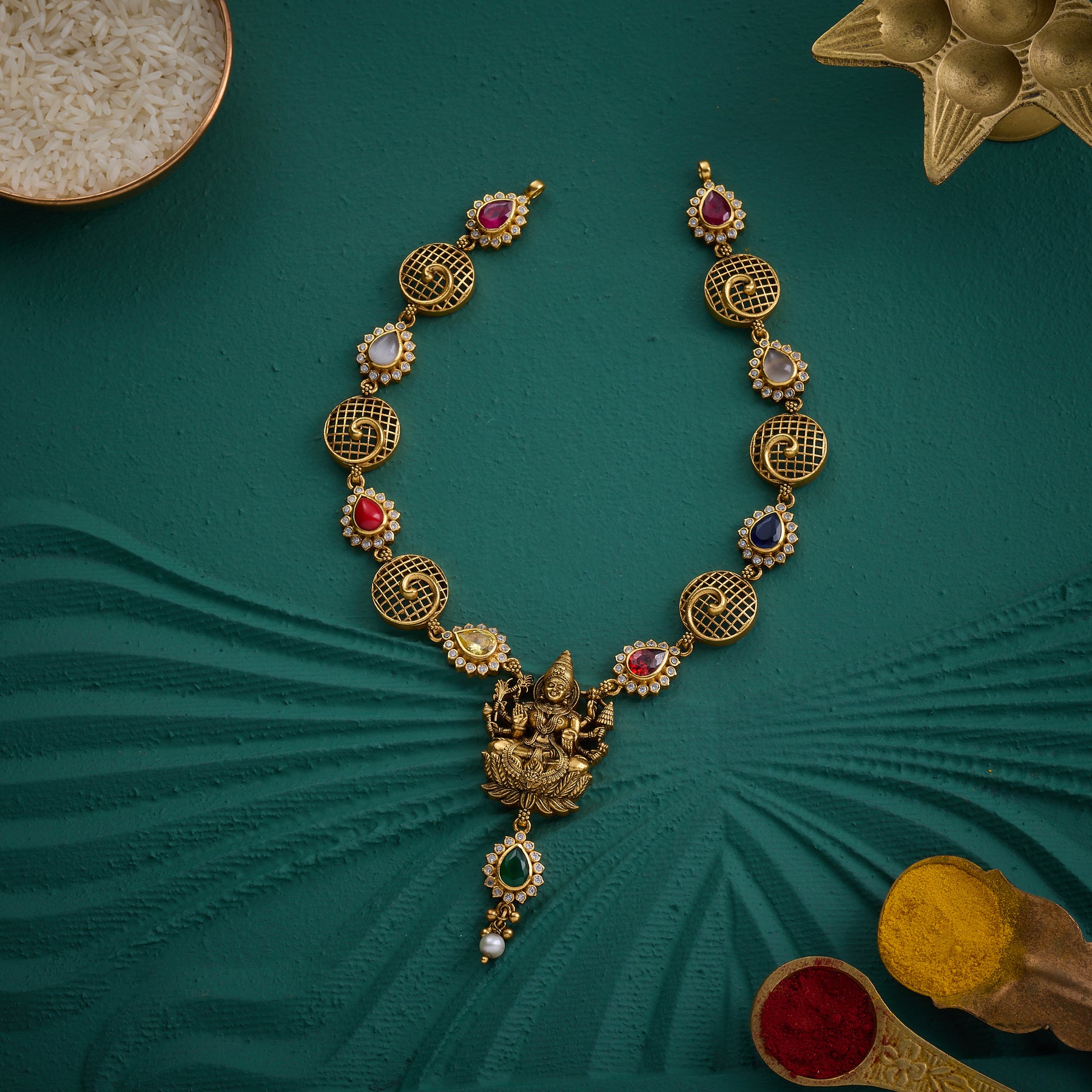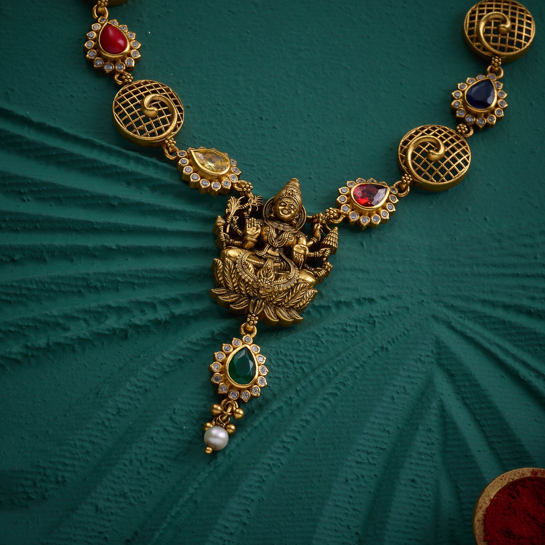 The Queen of Navaratna Short Necklace is expertly crafted featuring the revered Goddess Lakshmi adorned with vibrant Navaratna and sparkling Cubic Zirconia stones. A delicate Pearl and elegant Golden drop add refined detail, symbolizing prosperity and grace. This necklace combines traditional symbolism with exquisite craftsmanship, making it a meaningful and stunning piece for any collection.