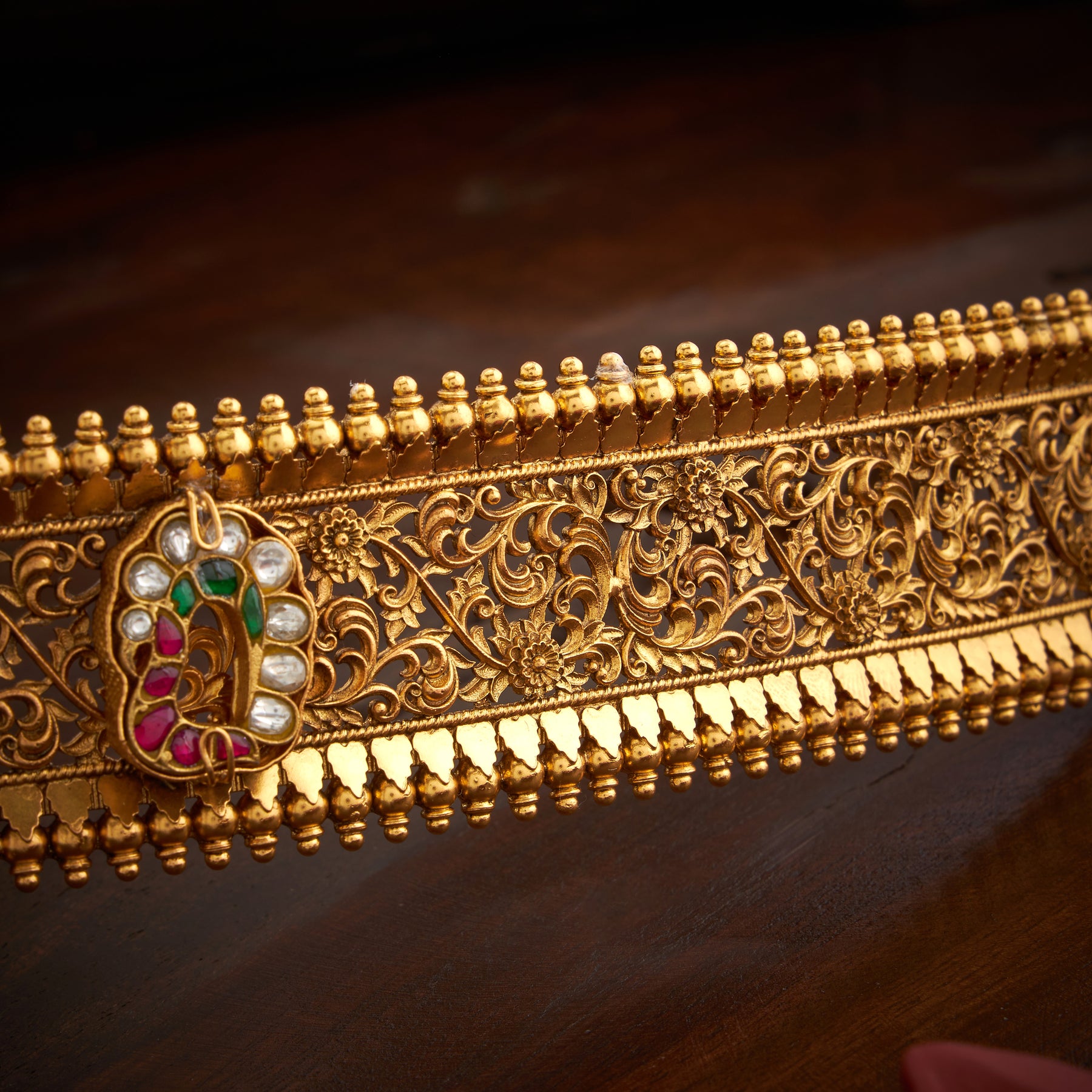 The Rajasi Mayuri Oddiyanam showcases exquisite craftsmanship with its intricate Peacock and Floral motifs, enhanced by dazzling Kundan work. Adorned with elegant hangings of Golden Beads, this waistband blends traditional artistry with regal charm, making it a perfect accessory to elevate ceremonial and festive attire. Its detailed design reflects expert artistry and cultural heritage, ensuring both beauty and sophistication.