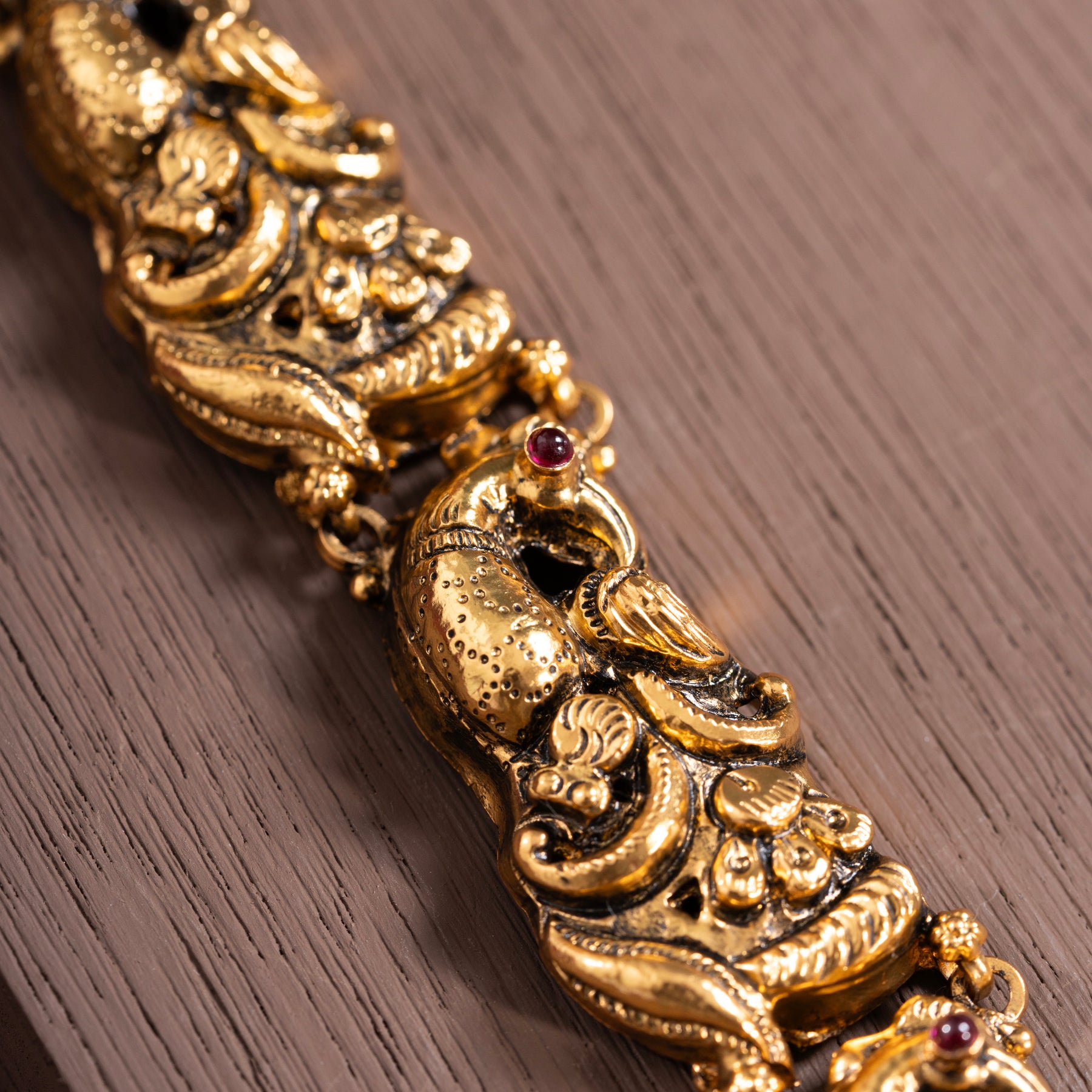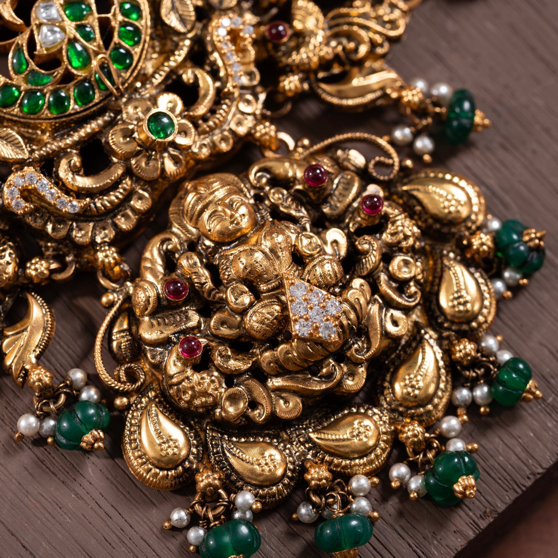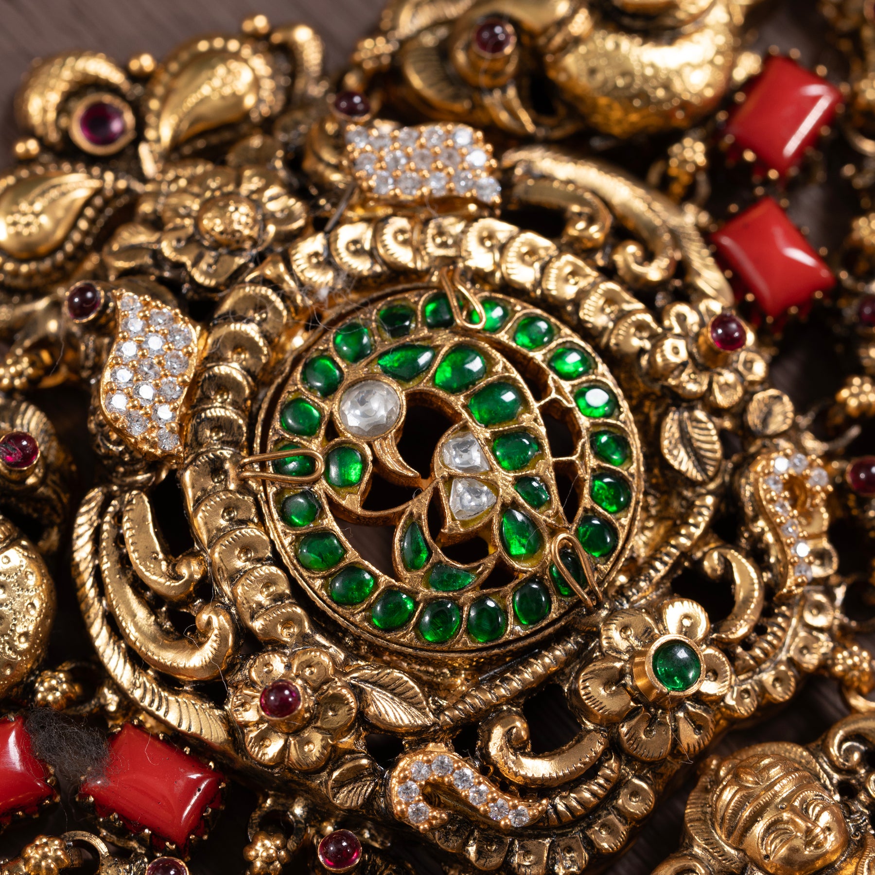 The Sampada Lakshmi Haaram is a masterfully crafted necklace featuring an intricate design of Goddess Lakshmi and elegant Peacock. Adorned with traditional Kundan Settings, this piece is enhanced by sparkling Cubic Zirconia stones, vibrant Emeralds, and Coral accents. Delicately Carved Emeralds and lustrous Pearl Hangings add depth and sophistication, making it a timeless statement of heritage and artistry. Perfect for special occasions, it blends cultural symbolism with exquisite craftsmanship.