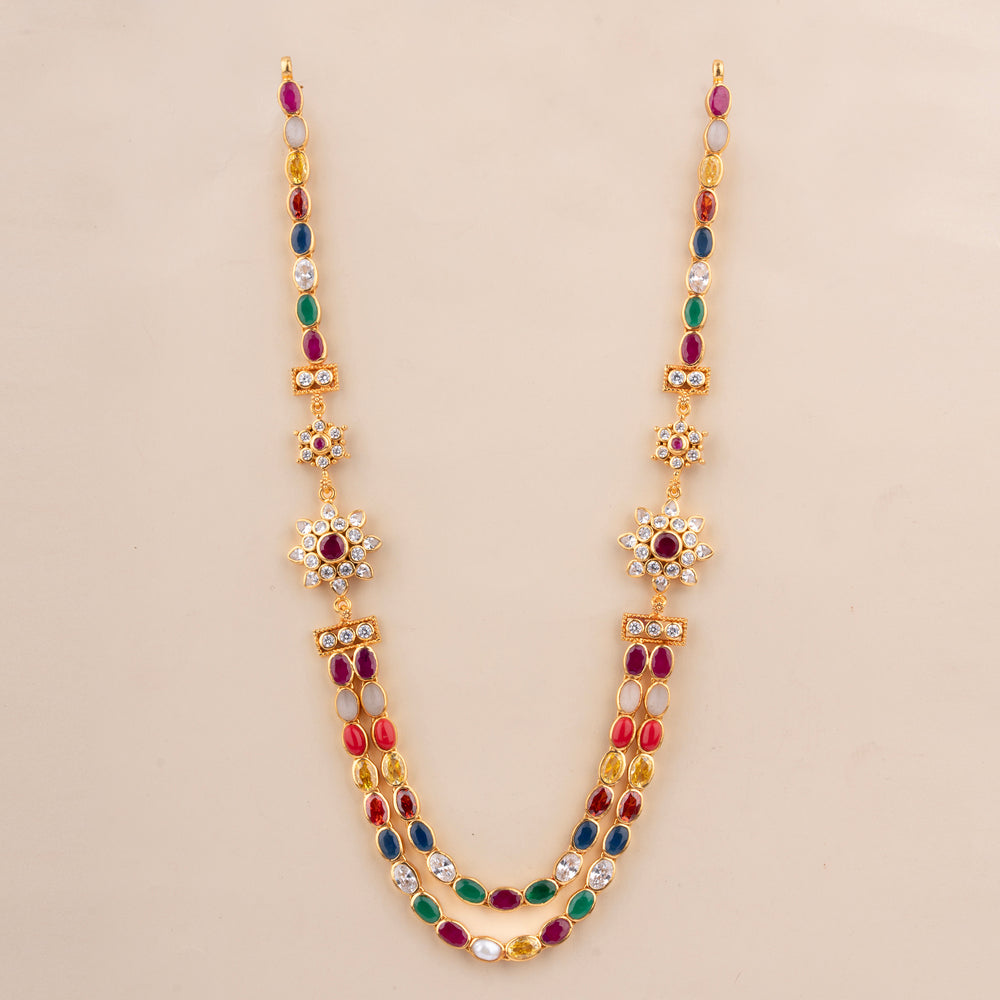 Elevate your style with the Samriddhi Ratna Necklace. This exquisite necklace features a beautiful Floral design adorned with Navaratna and CZ stones, all on a 2 layered chain. Perfect for adding a touch of elegance to any outfit.
