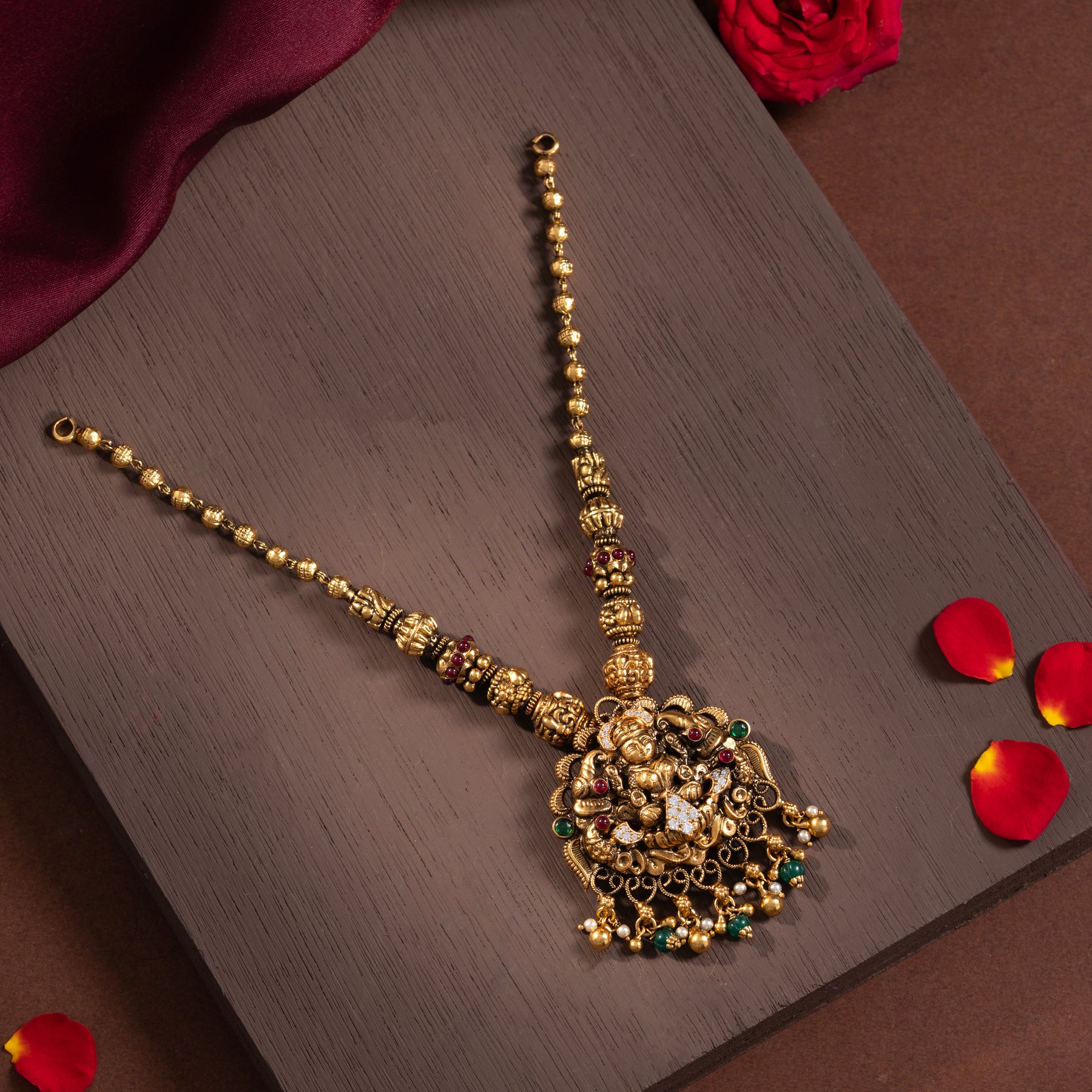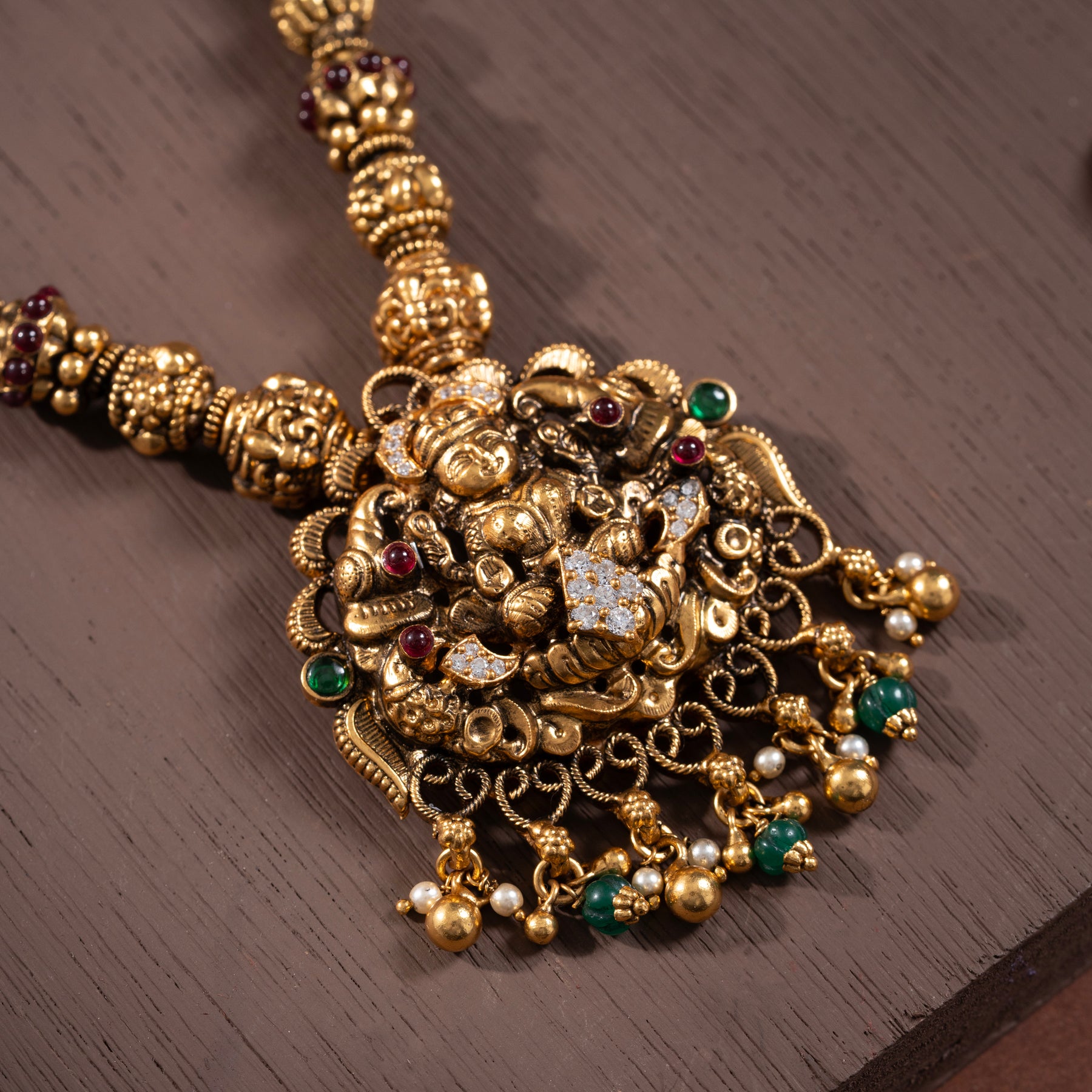 The Shree Gundu Short Necklace features intricate designs inspired by Lakshmi, Elephant, and Peacock, adorned with traditional Gundu Beads. Enhanced with sparkling CZ stones, vibrant Emeralds, and rich Rubies, this piece combines elegance and cultural symbolism. Accented with Golden and Emerald hangings, it offers a refined finish perfect for special occasions or as a statement accessory.