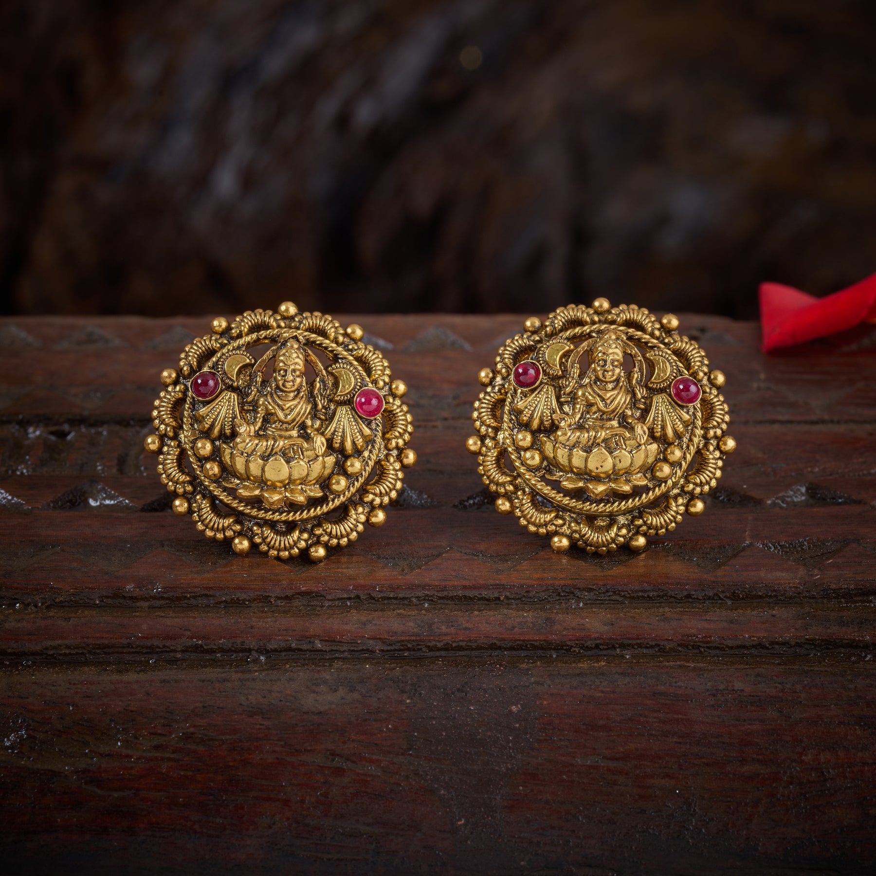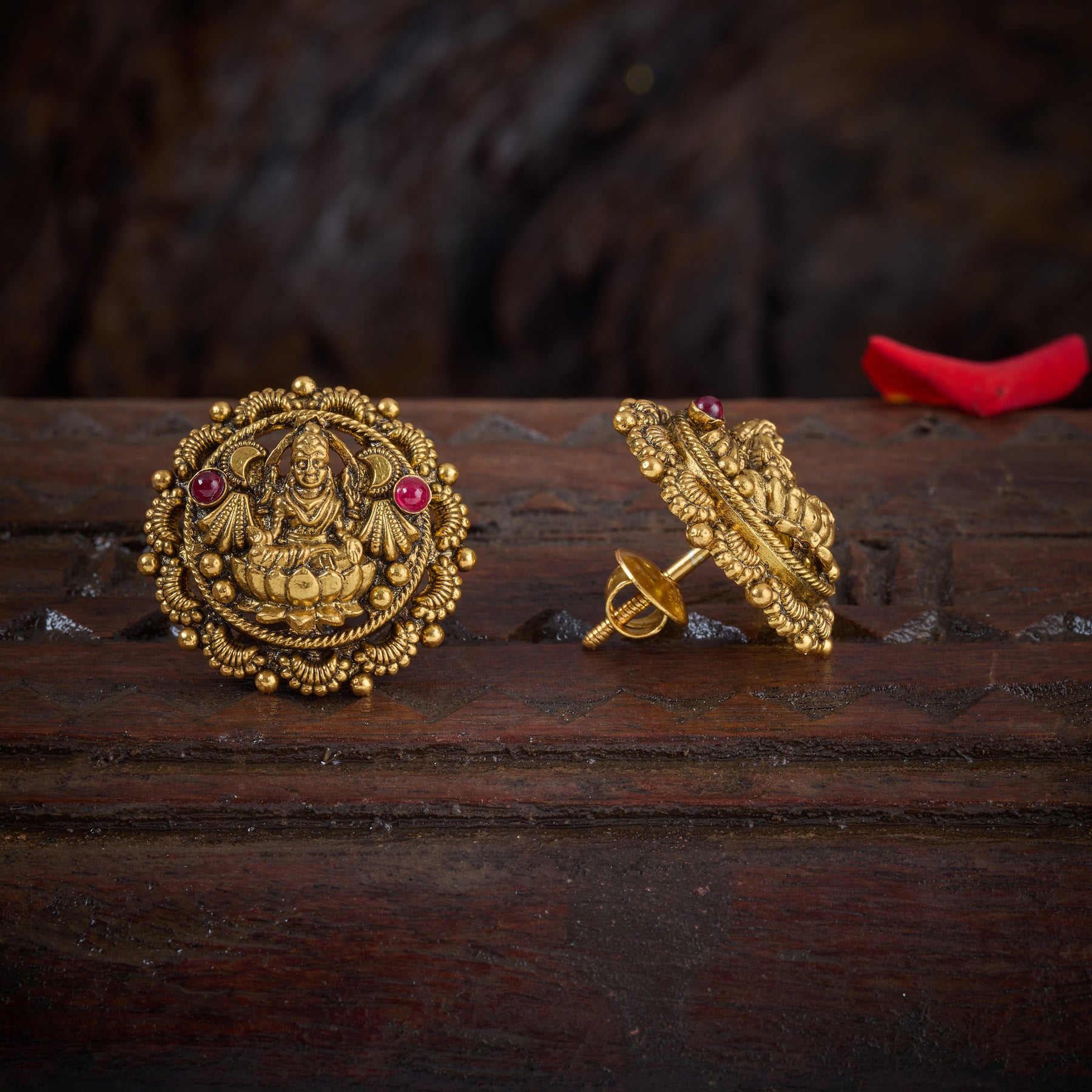 Shree Kamalambika Studs feature an elegant Floral design centred around the divine figure of Lakshmi, adorned with a striking Ruby. These expertly crafted earrings blend traditional symbolism with refined craftsmanship, making them perfect for those seeking both spiritual significance and timeless beauty in their jewellery.