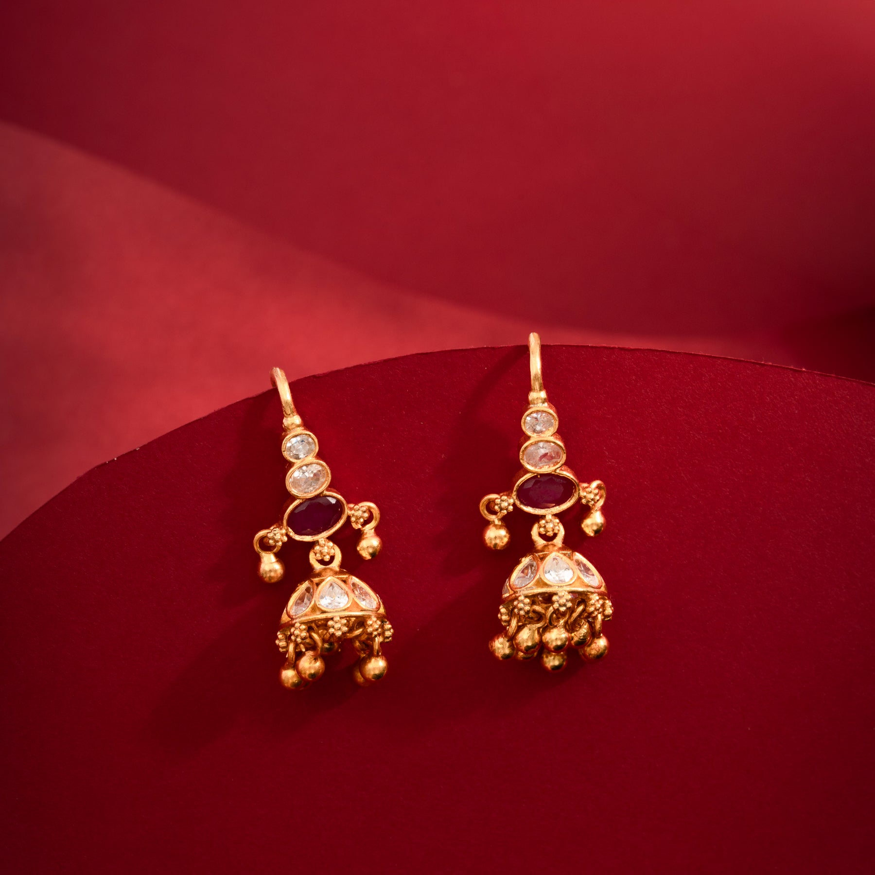 Elevate your ethnic ensemble with the Kiara Stone Jhumki, a sophisticated piece that seamlessly blends traditional craftsmanship with contemporary elegance. Adorned with lustrous Cubic Zirconia stones and Red accents, these jhumkis feature delicate Golden Beads that catch light with every movement. The harmonious interplay of precious-looking stones and warm metallic tones creates a refined aesthetic perfect for festive occasions and special celebrations. A timeless accessory that adds graceful dimension to your jewellery collection.