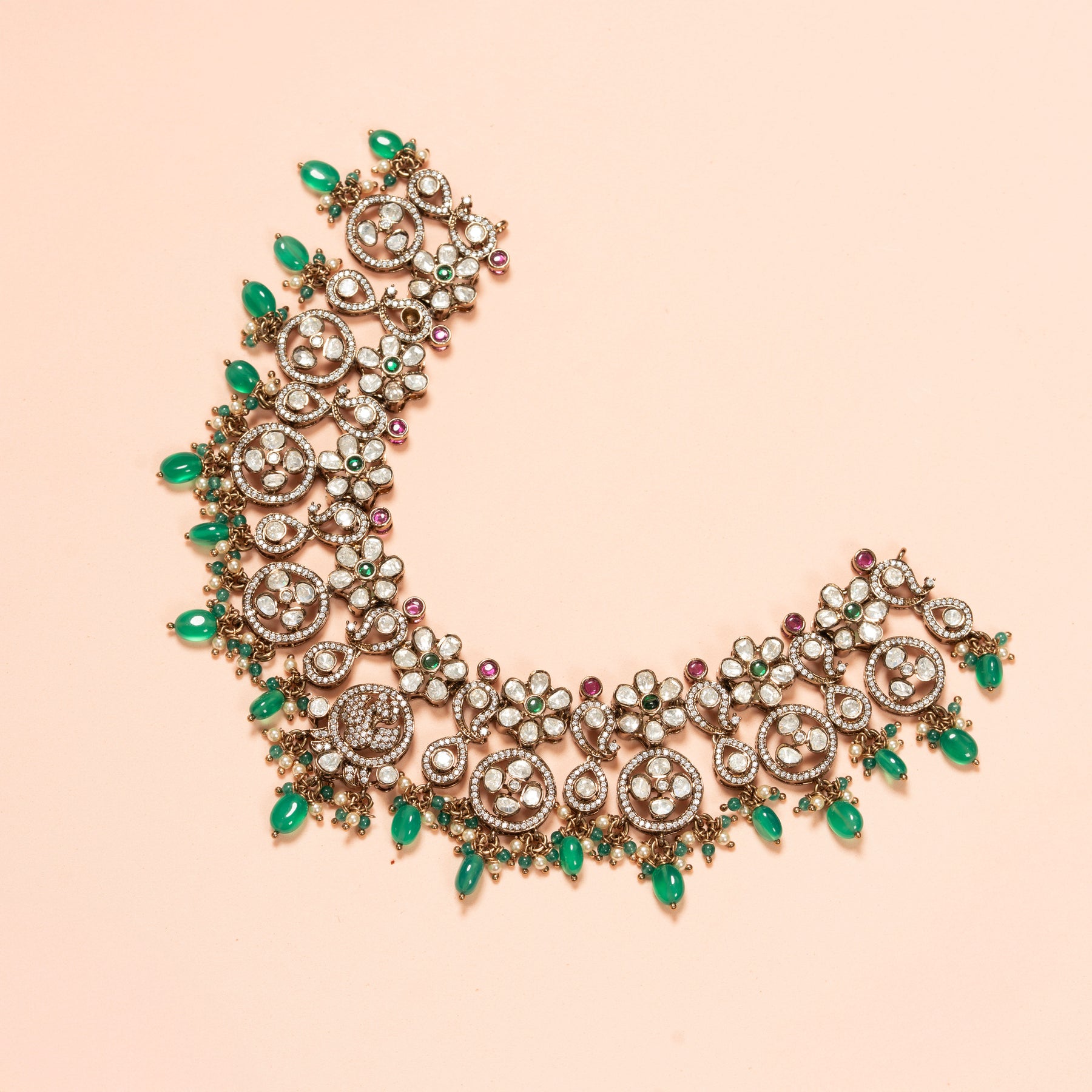 The Victalora Necklace showcases expert craftsmanship with a Floral design accented by Mango and Pear motifs. Adorned with brilliant CZ stones and Moissanite, it captures light with exceptional sparkle. Delicate Emerald hangings add a refined touch, making this piece a sophisticated choice for those seeking elegance and timeless beauty.
