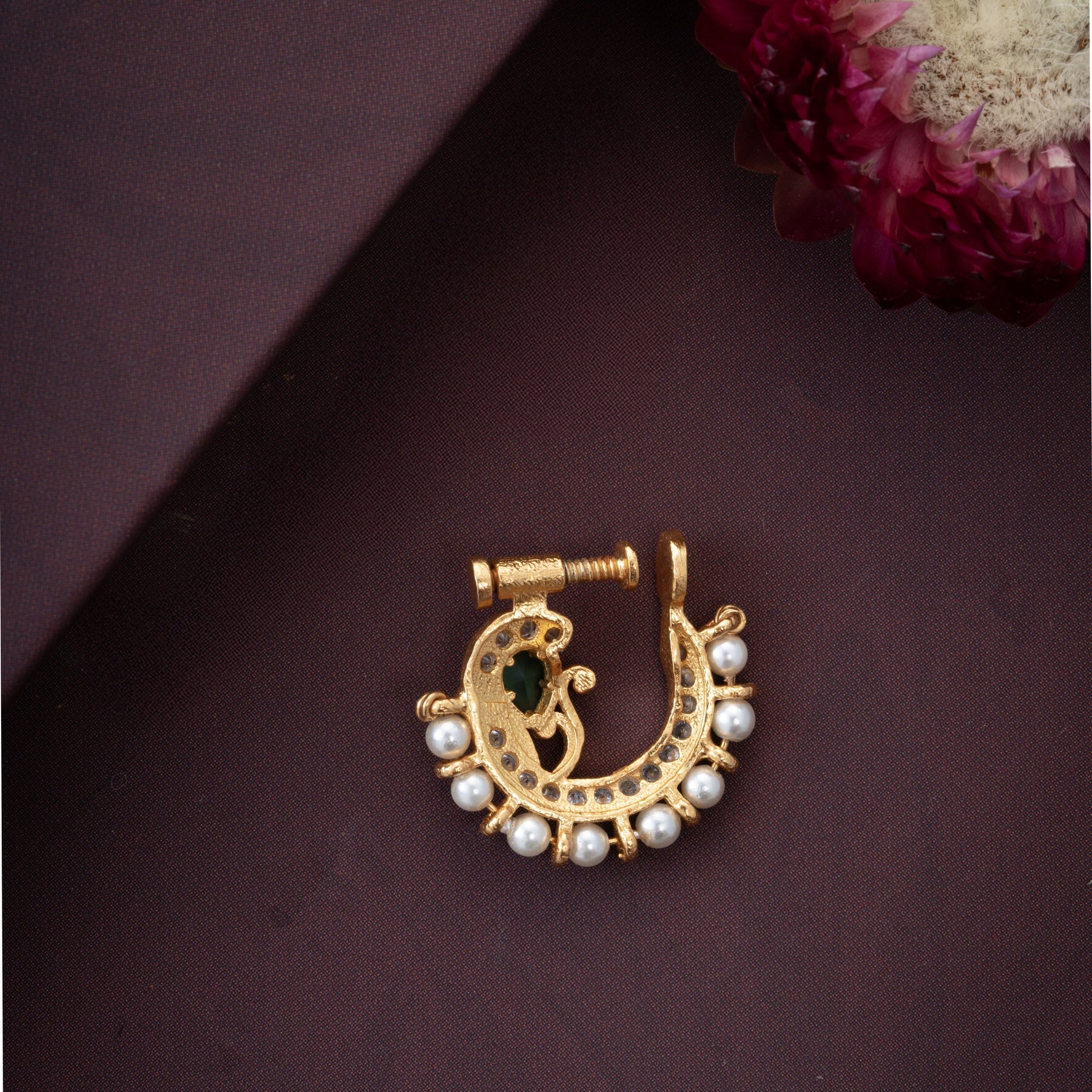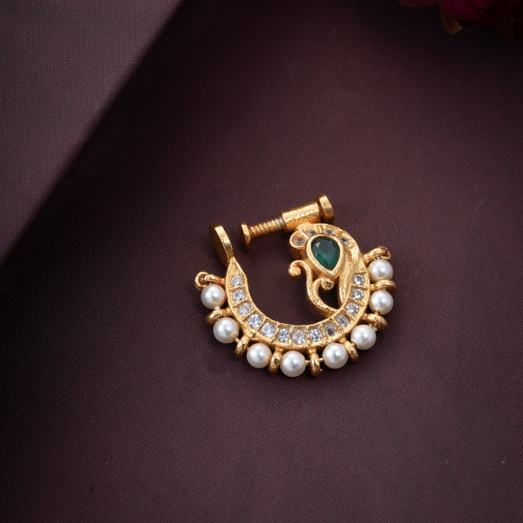 Bindura Nath showcases a sophisticated design featuring a Pear-shaped Emerald as its centrepiece, complemented by sparkling Cubic Zirconia stones and lustrous Pearl beads. This combination creates a refined aesthetic that balances the deep, verdant allure of the Emerald with the brilliance of CZ accents and the soft elegance of Pearls. The Pear cut enhances the Emerald's natural beauty while the Pearl beads add a classic, timeless dimension. An ideal piece for those seeking a distinctive blend of semi-precious elements with traditional craftsmanship.