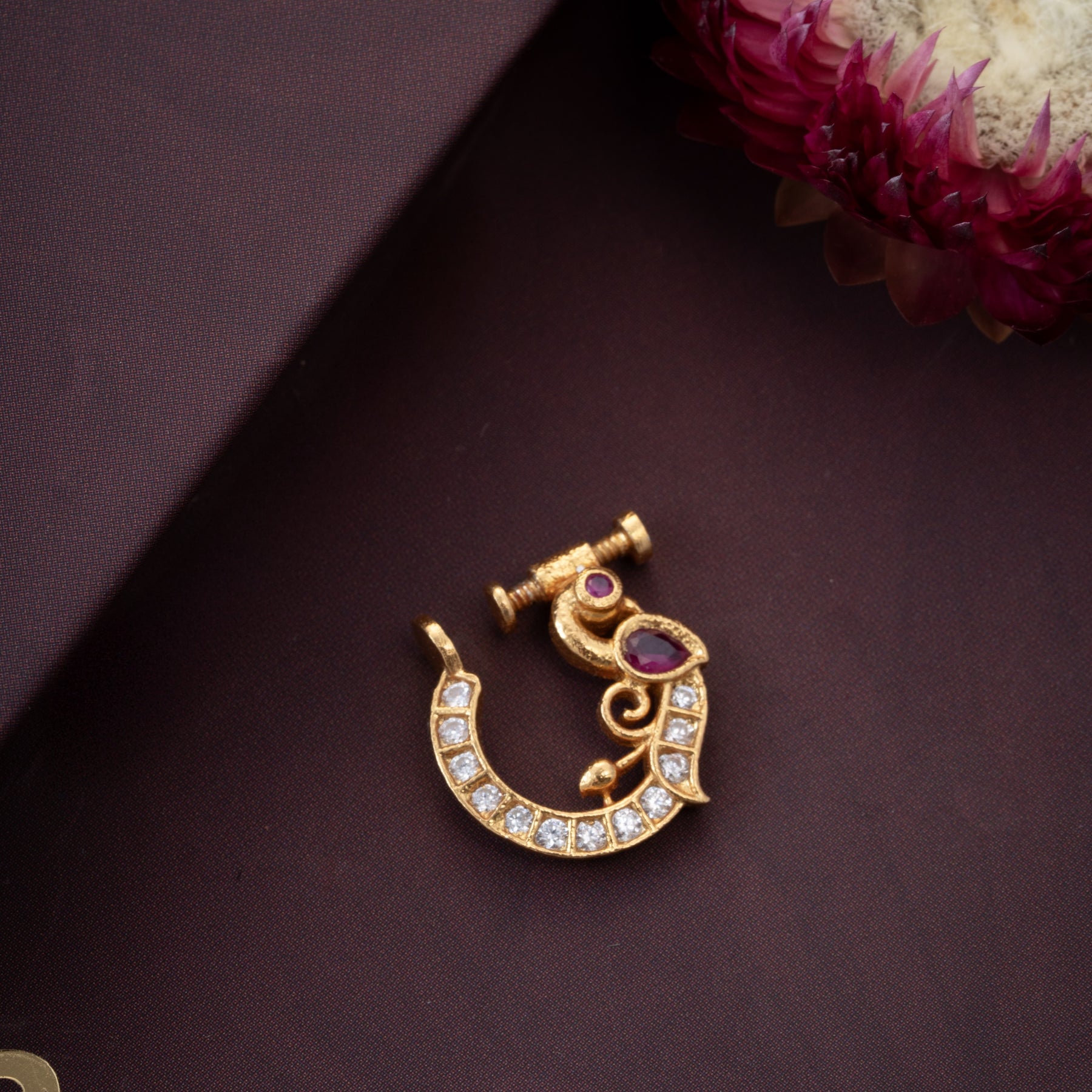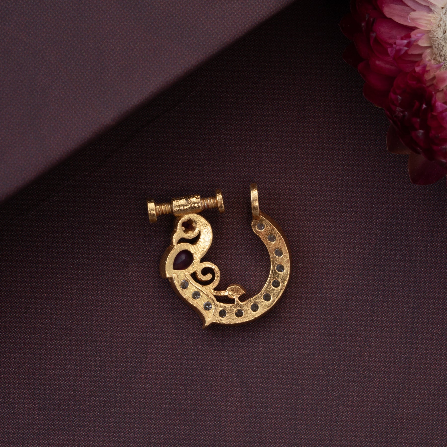 The Mor Madhavi Nath showcases exquisite craftsmanship with a stunning Peacock adorned with brilliant Cubic Zirconia stones and deep Ruby accents. This piece combines traditional design elements with contemporary sparkle, creating a versatile accessory that transitions seamlessly special occasions. The Peacock symbolism adds cultural richness, while the carefully selected gemstones ensure lasting radiance and durability. Perfect for those who appreciate intricate detailing and timeless elegance.