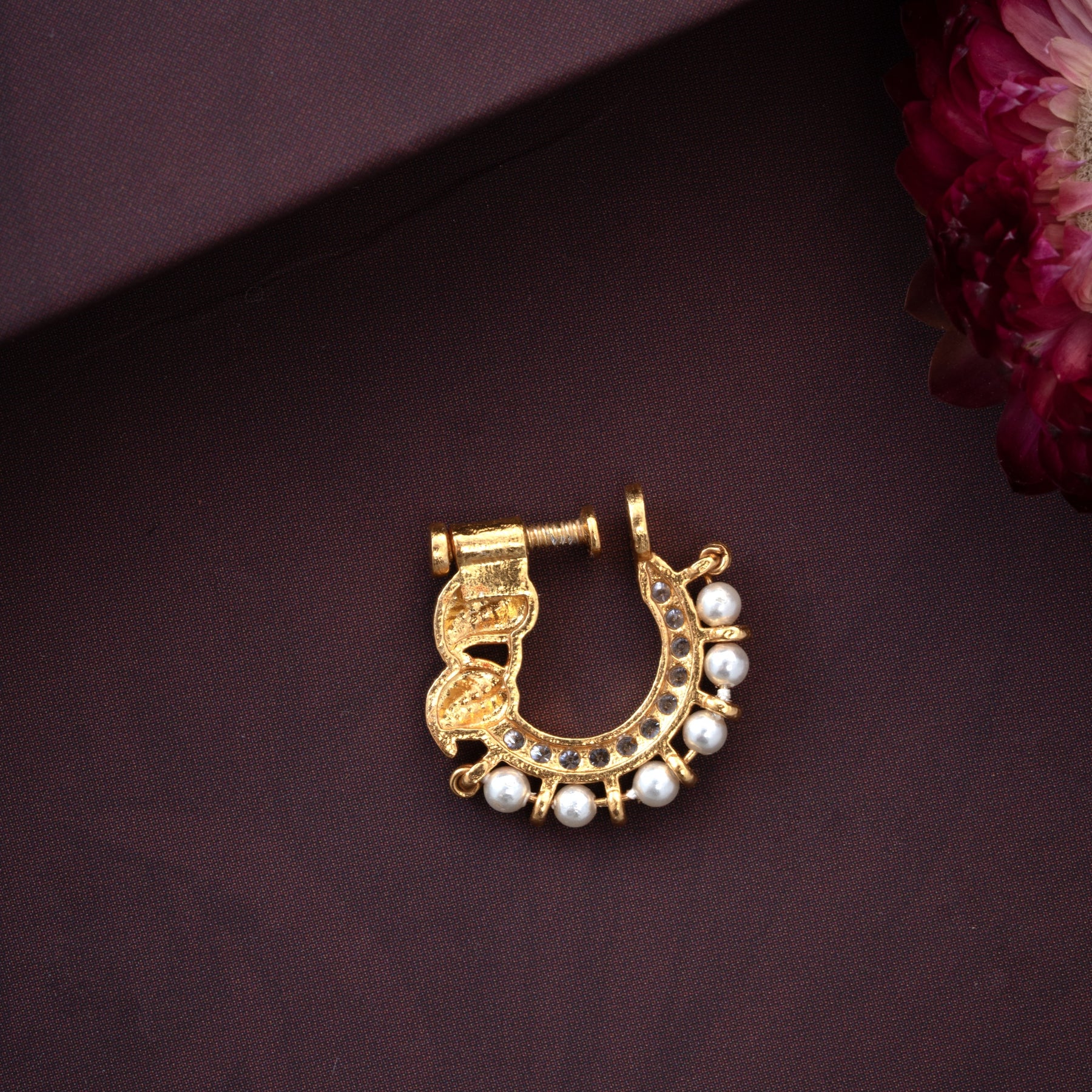 The Patra Nathika combines traditional craftsmanship with refined elegance. This exquisite piece features delicate Leaf motifs intricately designed and embellished with sparkling Cubic Zirconia stones and lustrous Pearl beads. Each element is carefully positioned to create a harmonious balance of texture and shimmer, making it an ideal choice for festive occasions, weddings, or special celebrations. The interplay of the ornamental leaves with the brilliance of the stones and the soft glow of Pearls creates a sophisticated accessory that enhances traditional attire with timeless grace.