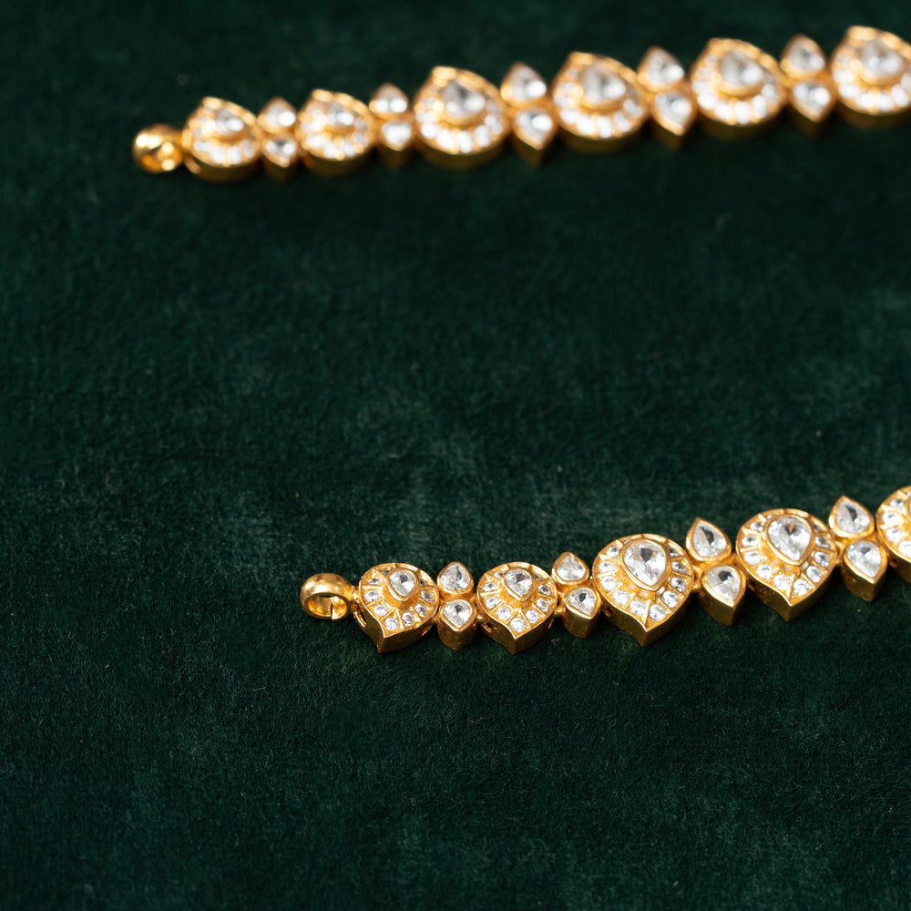 This Aamra Pear Short Necklace is crafted with precision and elegance, featuring a stunning combination of Mango and Pear-shaped stones accented with CZ stones and Emerald pieces. The necklace is adorned with hanging pears and golden beads, making it a dazzling addition to any outfit. Elevate your style with this unique and luxurious piece.