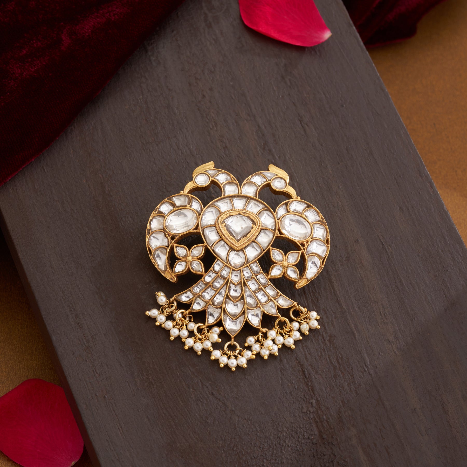 The Dual Wing Frost Pendant showcases the majestic Gandberunda motif, expertly crafted with exquisite Kundan detailing. Complemented by delicate Pearl hangings, this pendant combines traditional artistry with refined elegance, making it a distinguished piece for those who appreciate intricate craftsmanship.