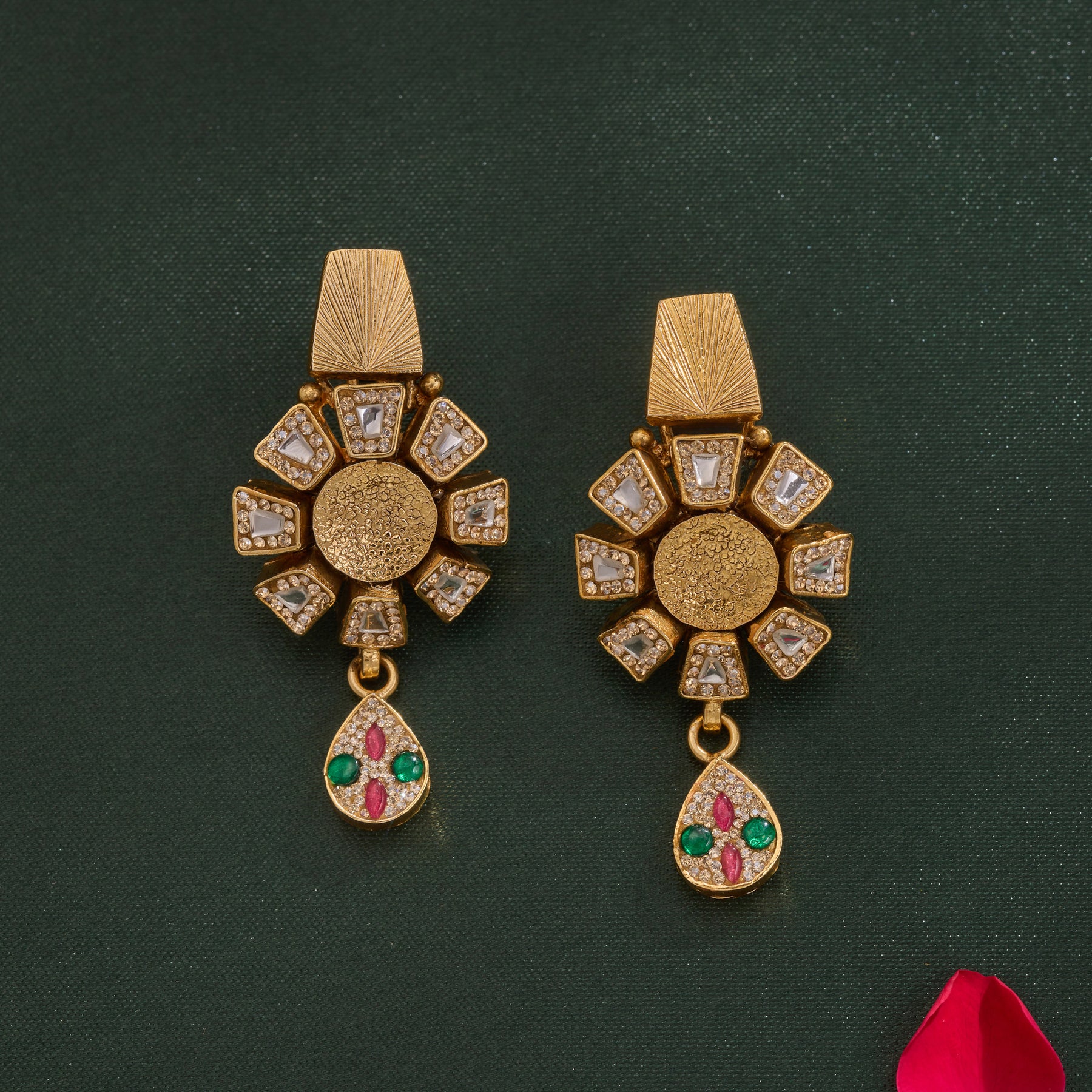 The Pushpreya Necklace Set showcases exquisite craftsmanship with floral motifs and Pear-shaped designs, elegantly adorned with dazzling Kundan and Cubic Zirconia stones. The delicate Pear-shaped hangings add a graceful touch, making this set perfect for enhancing traditional and contemporary looks with refined sophistication.
