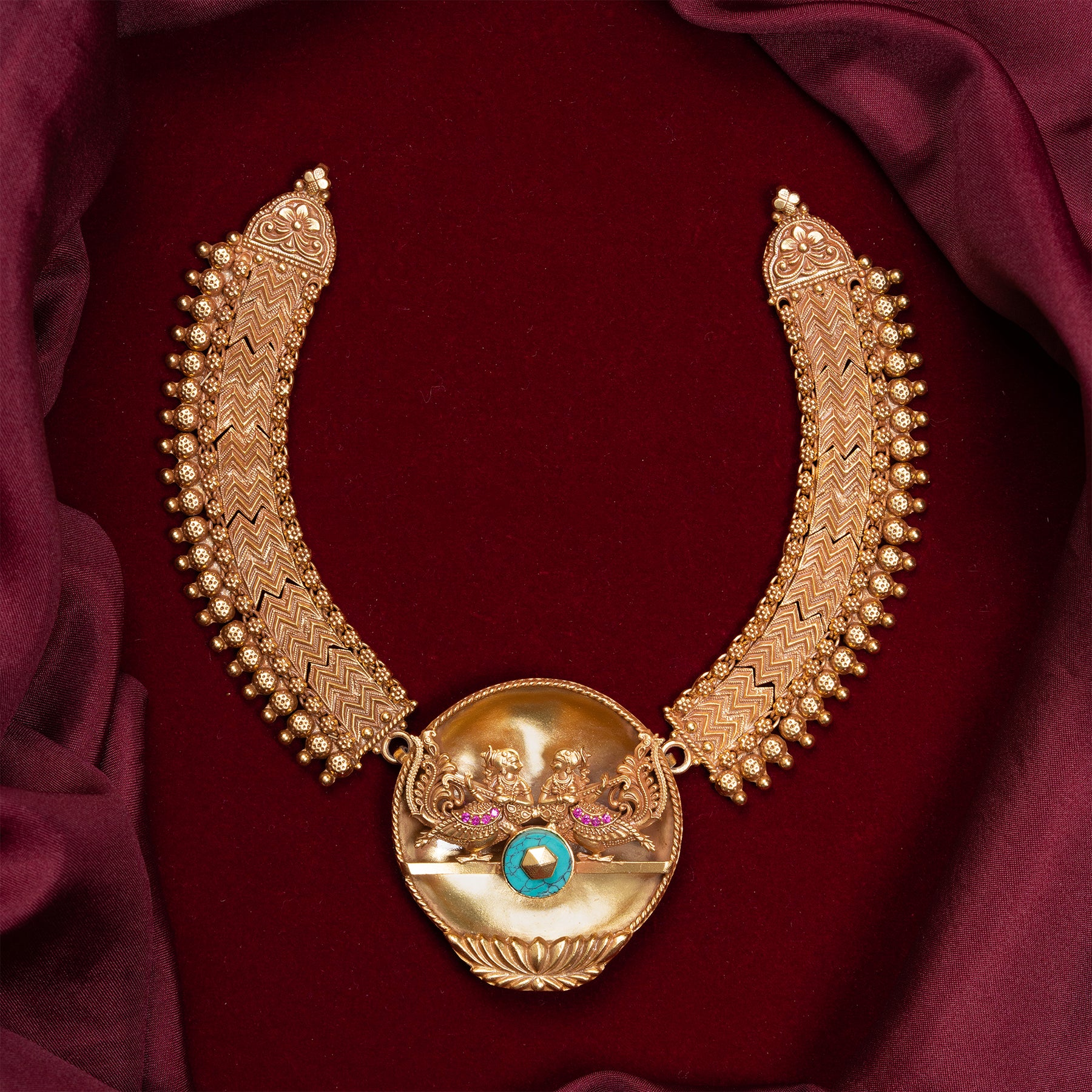 The Dhwani Kamalini Necklace features intricate Motifs of Girls intertwined with Lotus designs, accented by vibrant Rubies and Turquoise stone. This exquisite craftsmanship highlights traditional artistry while adding a touch of elegance and colour , making it a distinguished choice for those who appreciate detailed and meaningful jewellery. Perfect for special occasions, it combines cultural symbolism with refined beauty.