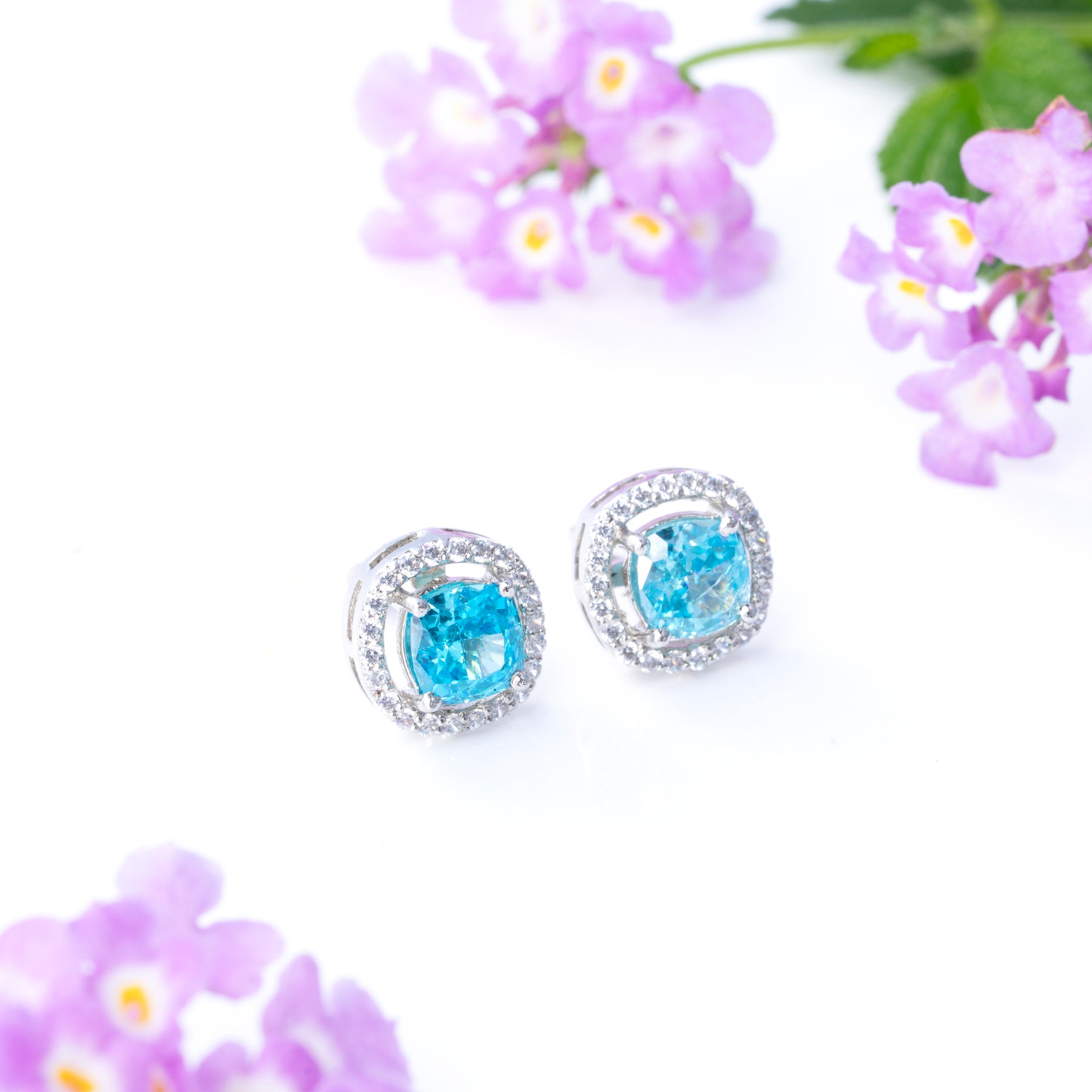 Crafted with precision and elegance, our Blue Silque Studs feature a Cushion cut design and exquisite Aquamarine and cz stones. Enhance your look with their sparkling beauty and experience the benefits of craftsmanship. A must-have for any jewellery collection.