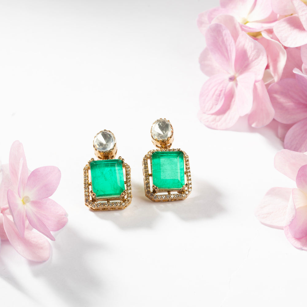 The EmeraTryst Necklace Set features an elegant Square-Cut Emerald centerpiece complemented by Oval Moissanite stones. Precision-set Cubic Zirconia accents enhance the sophisticated design, creating a harmonious balance of color and brilliance. This meticulously crafted set offers exceptional clarity and light performance for discerning jewellery connoisseurs.