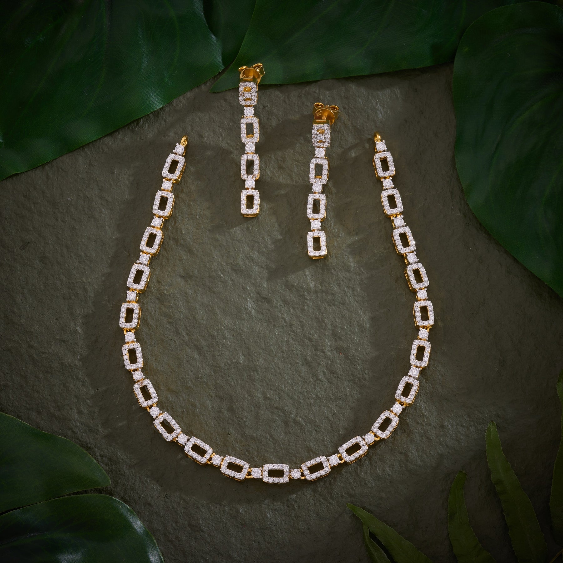 The Recta CZ Linkora Necklace Set features interconnected Rectangular motifs brilliantly adorned with Cubic Zirconia stones. Each geometric segment links seamlessly, creating a modern, structured design with exceptional sparkle and sophistication.