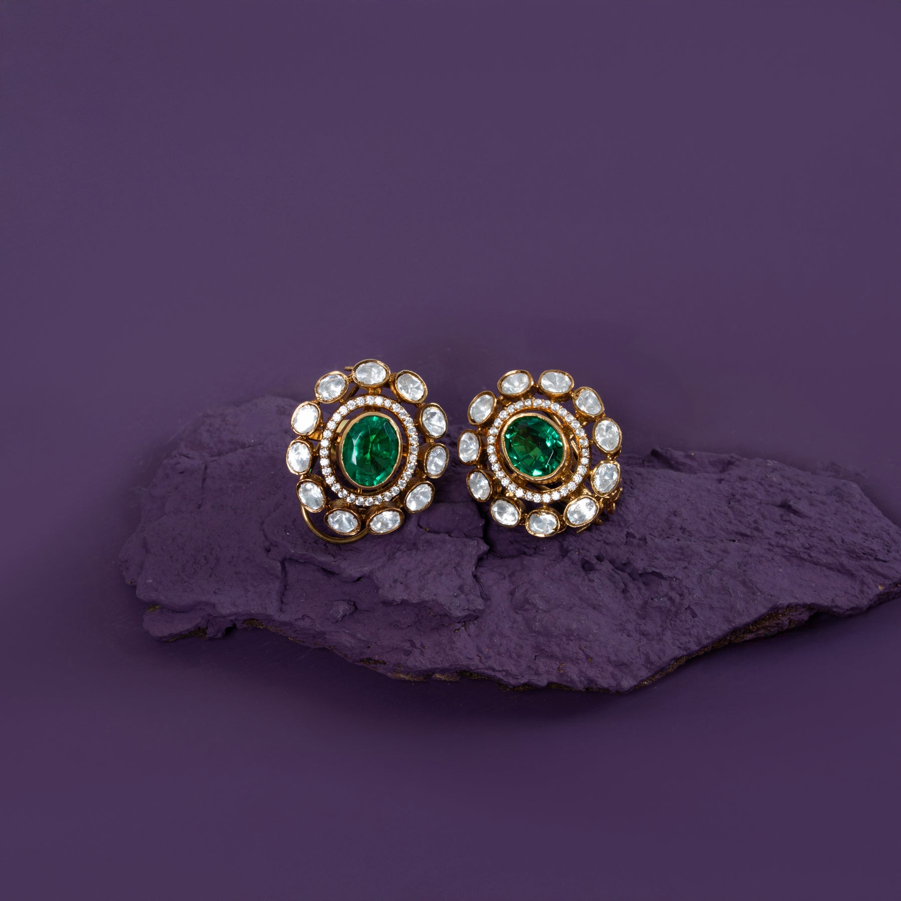 The Regal Gardenia Studs showcase a masterful Floral design accented with sparkling Moissanites, dazzling Cubic Zirconia stones, and rich Green Emeralds. This elegant combination offers brilliance and color, perfect for adding a refined touch to any ensemble. Meticulously crafted to highlight each stone’s unique beauty, these studs are an expert choice for those seeking timeless sophistication.