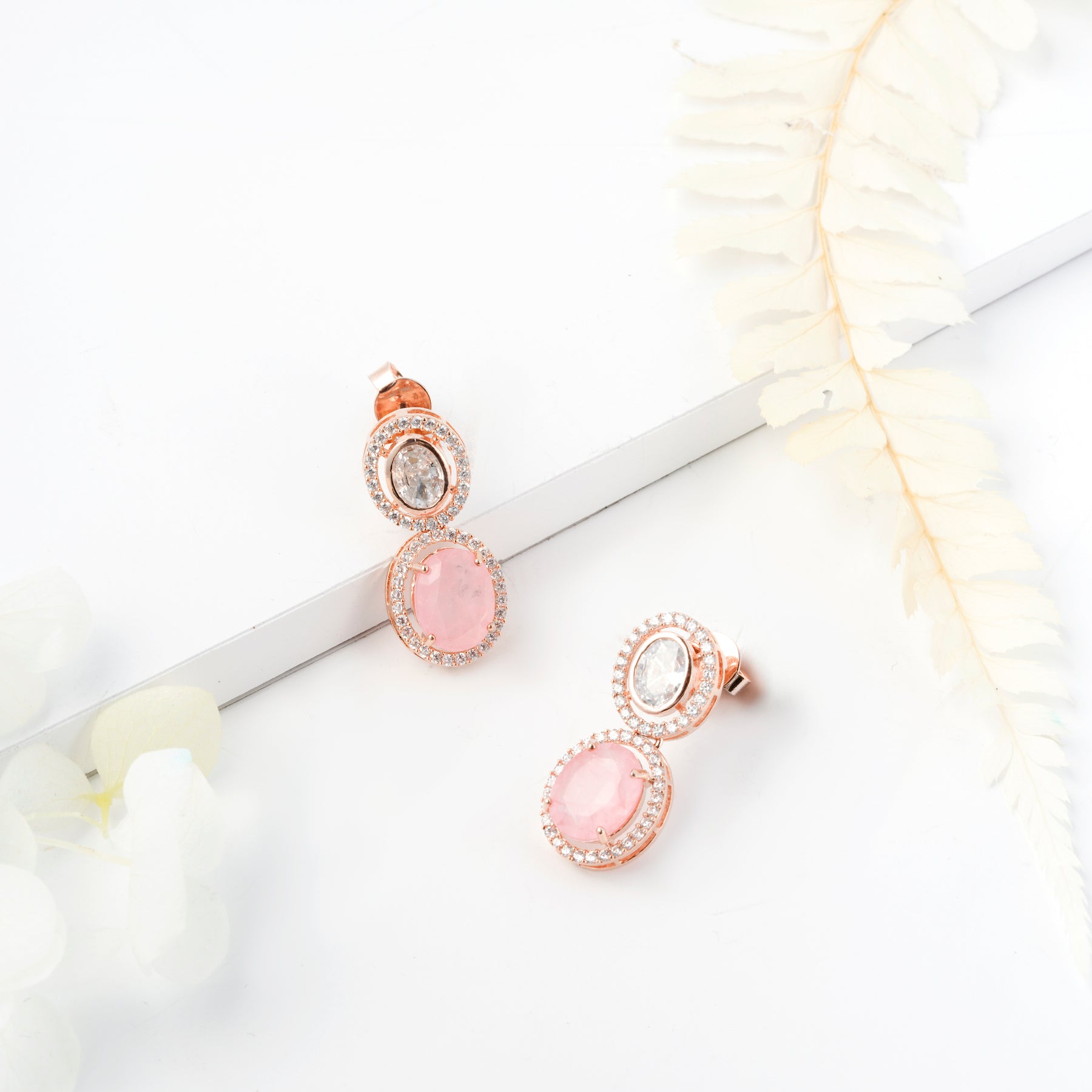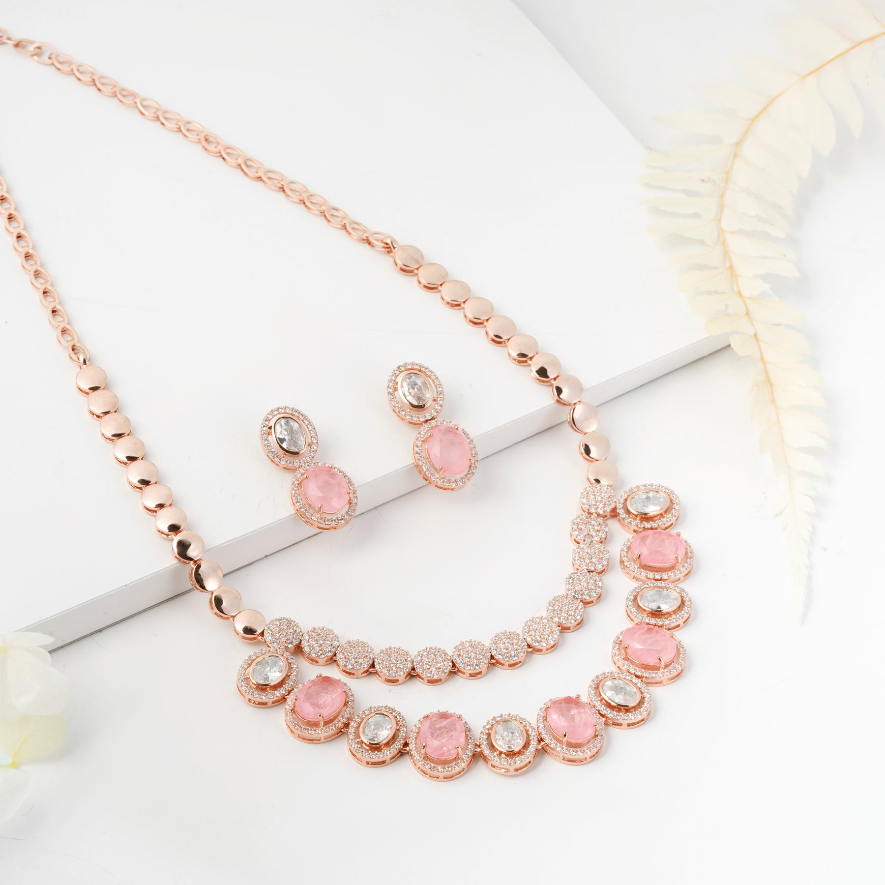 The Blush Berry Necklace Set features an elegant Oval design accented with soothing Rose Quartz and sparkling CZ stones. This combination offers a refined aesthetic that enhances any outfit with a touch of subtle luxury and balance. Perfect for those seeking a blend of timeless beauty and expert craftsmanship.