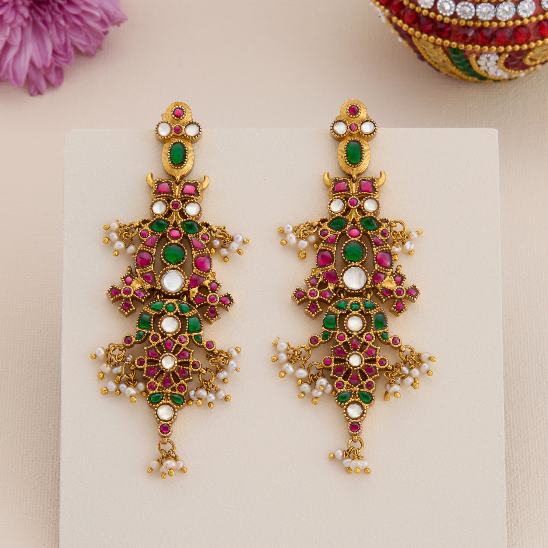 Ratna Tarangini Danglers showcase an expert blend of traditional artistry and elegant design. Featuring a harmonious combination of Round, Floral, and Oval shapes embellished with exquisite Kundan work, these earrings are further enhanced by delicate pearl hangings that add graceful movement. Perfectly crafted to elevate both festive and formal ensembles, these danglers offer a refined statement of timeless beauty.