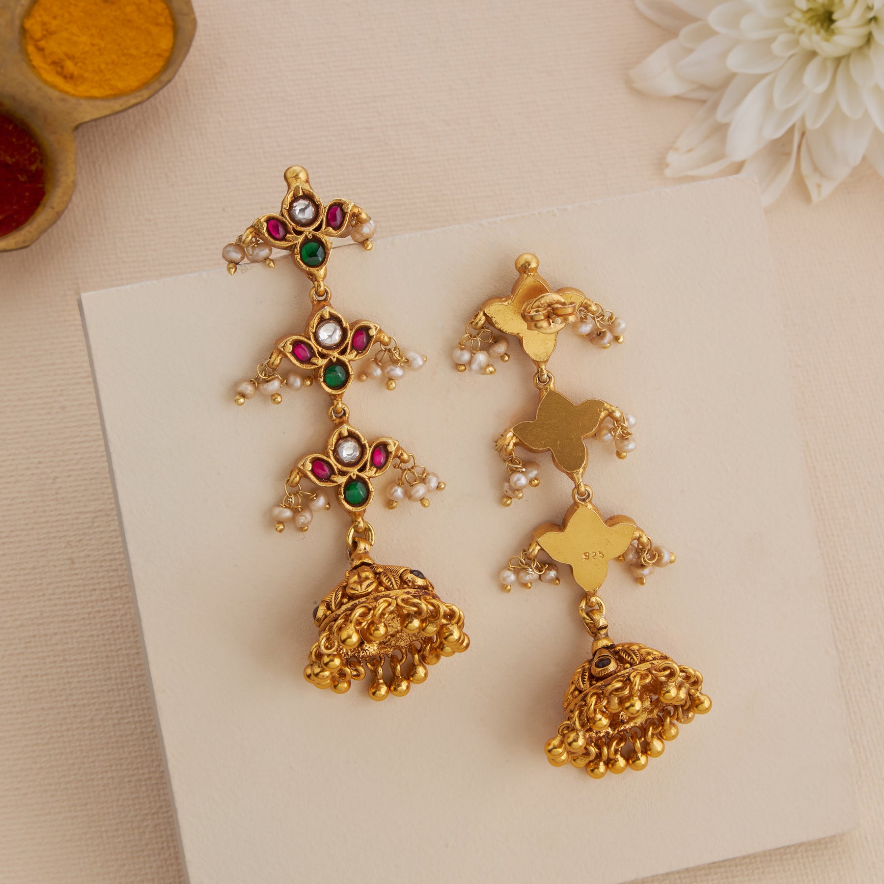 The Lotus Bliss Danglers showcase exquisite craftsmanship, featuring intricate Lotus and leaf motifs adorned with sparkling kundan stones. Delicately accented by elegant hangings of Pearls and Golden Beads, these earrings blend traditional artistry with refined elegance, making them perfect for enhancing any sophisticated ensemble.