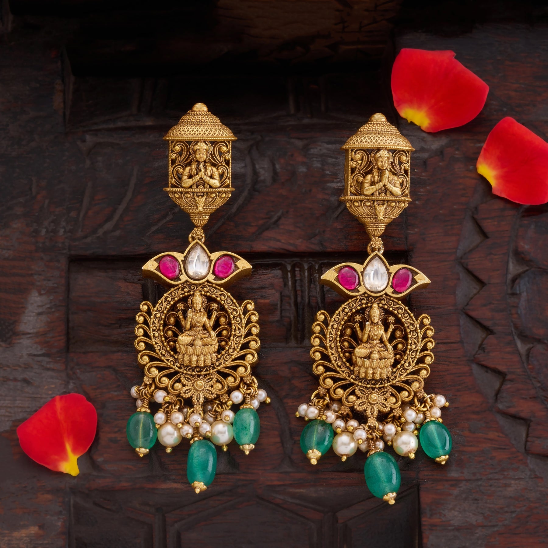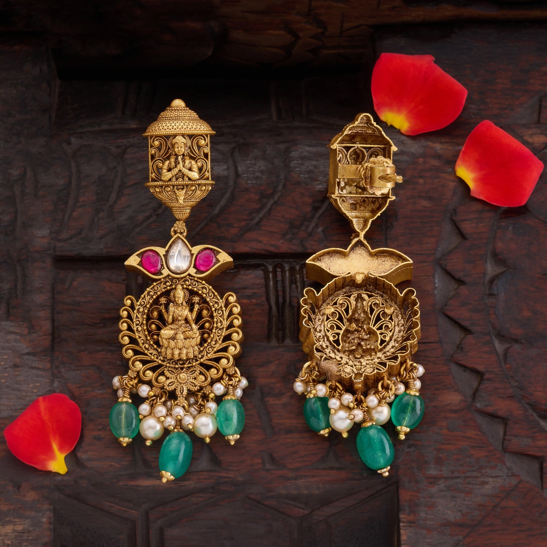 Dhana Devi Danglers showcase exquisite craftsmanship with a Lakshmi motif set in lustrous Kundan work. The design features rich Ruby stones complemented by luminous Pearls and vibrant Emerald hangings that create graceful movement. Each element is carefully positioned to enhance the spiritual significance of the piece while delivering sophisticated elegance. Perfect for festive occasions and celebrations, these danglers combine traditional artistry with refined aesthetics, making them a distinguished addition to your jewellery collection.