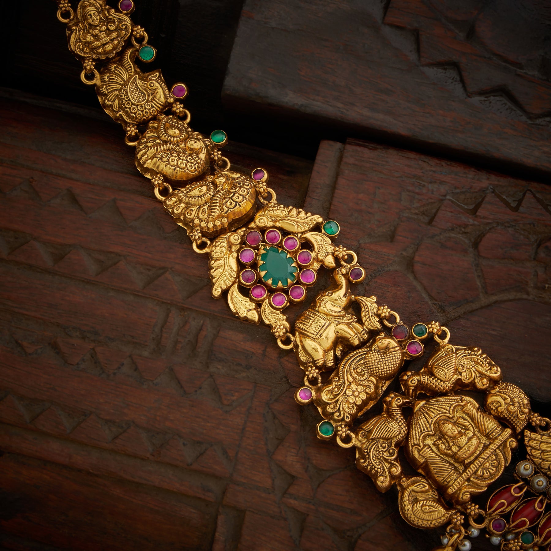 The Shri Mayurvilas Haaram is intricately crafted to showcase exquisite peacock and Lakshmi motifs, symbolizing beauty and prosperity. Adorned with vibrant emeralds and corals, this necklace captures rich color contrasts that enhance its traditional appeal. Delicate hangings of golden beads and pearls add movement and elegance, making it a distinguished piece that complements ceremonial and festive attire with grace and sophistication.