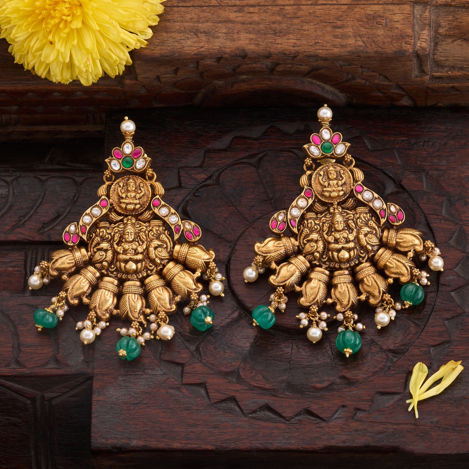 Kanak Kalasha Danglers showcase exquisite craftsmanship with sacred Lakshmi and Kalash motifs rendered in Kundan setting. These earrings feature a harmonious blend of Emerald and Ruby gemstones, complemented by lustrous Pearls and intricately carved Emerald hangings. The traditional design celebrates prosperity symbolism while the semi gemstone selection ensures timeless elegance. Perfect for festive occasions and special celebrations, these danglers combine spiritual significance with sophisticated jewellery artistry.