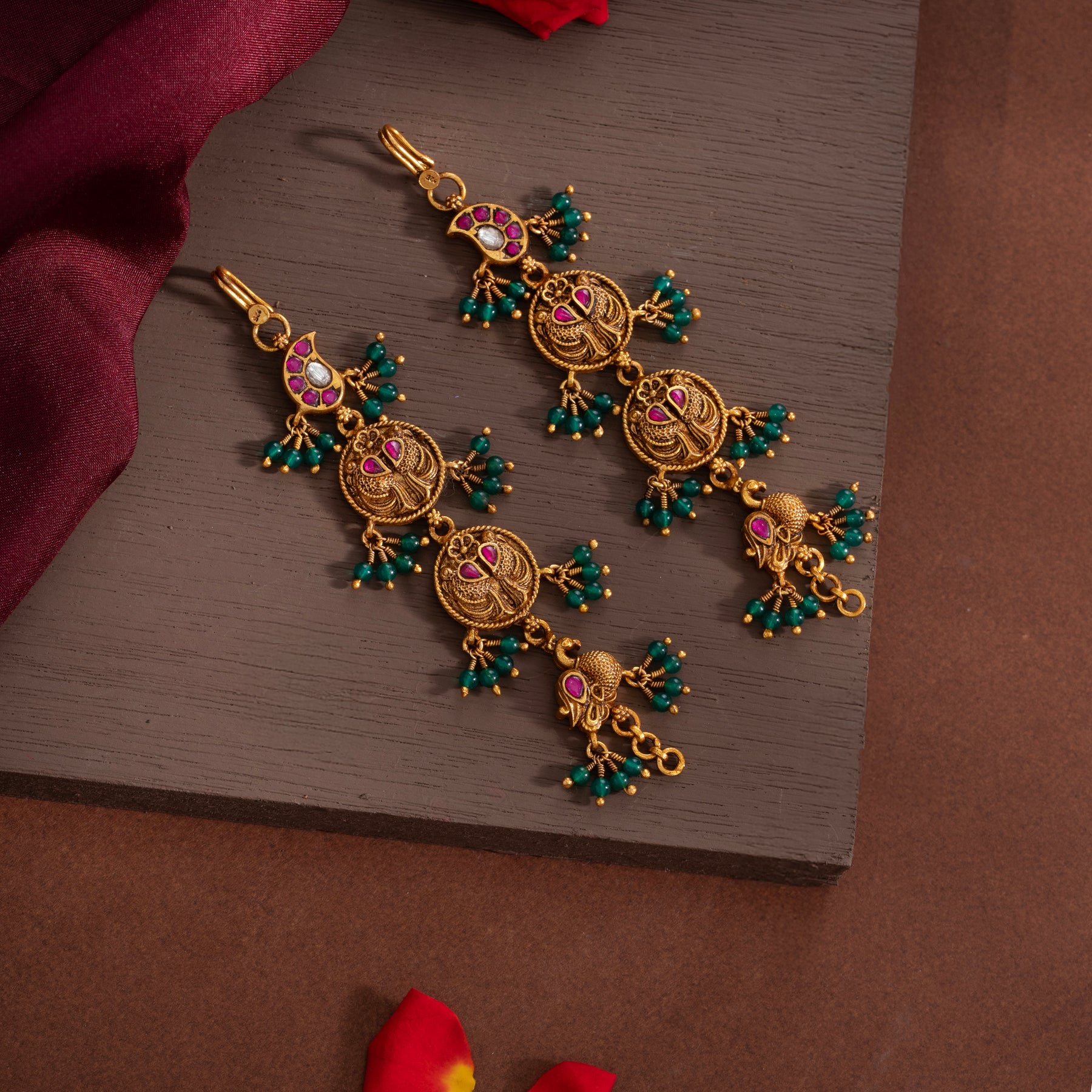 The Mayura Madhuri Matil showcases an exquisite Peacock design intricately crafted with traditional Kundan settings. Accentuated by vibrant Emerald hangings, this piece reflects refined artistry and cultural elegance, making it a distinguished addition to your collection.