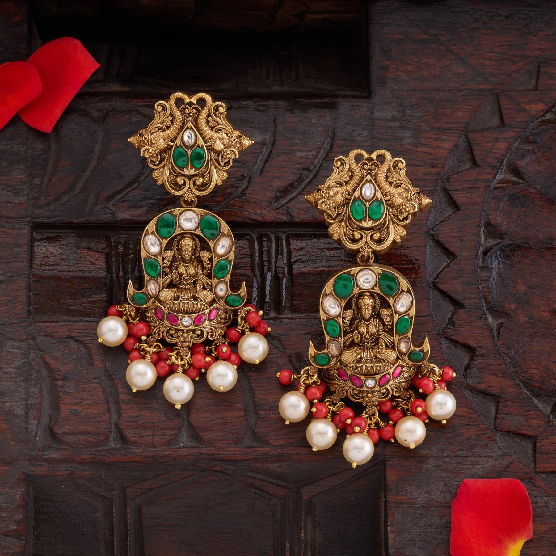 Shree Nupur Danglers showcase exquisite craftsmanship with intricate Peacock and Lakshmi motifs, hallmarks of traditional Indian artistry. Each piece features Kundan settings adorned with Emeralds and Rubies, complemented by lustrous Pearl and Coral hangings that add graceful movement. The combination of semi gemstones and organic materials creates a sophisticated aesthetic, perfect for elevating festive occasions and celebrations. These danglers embody timeless elegance with meticulous attention to detail.