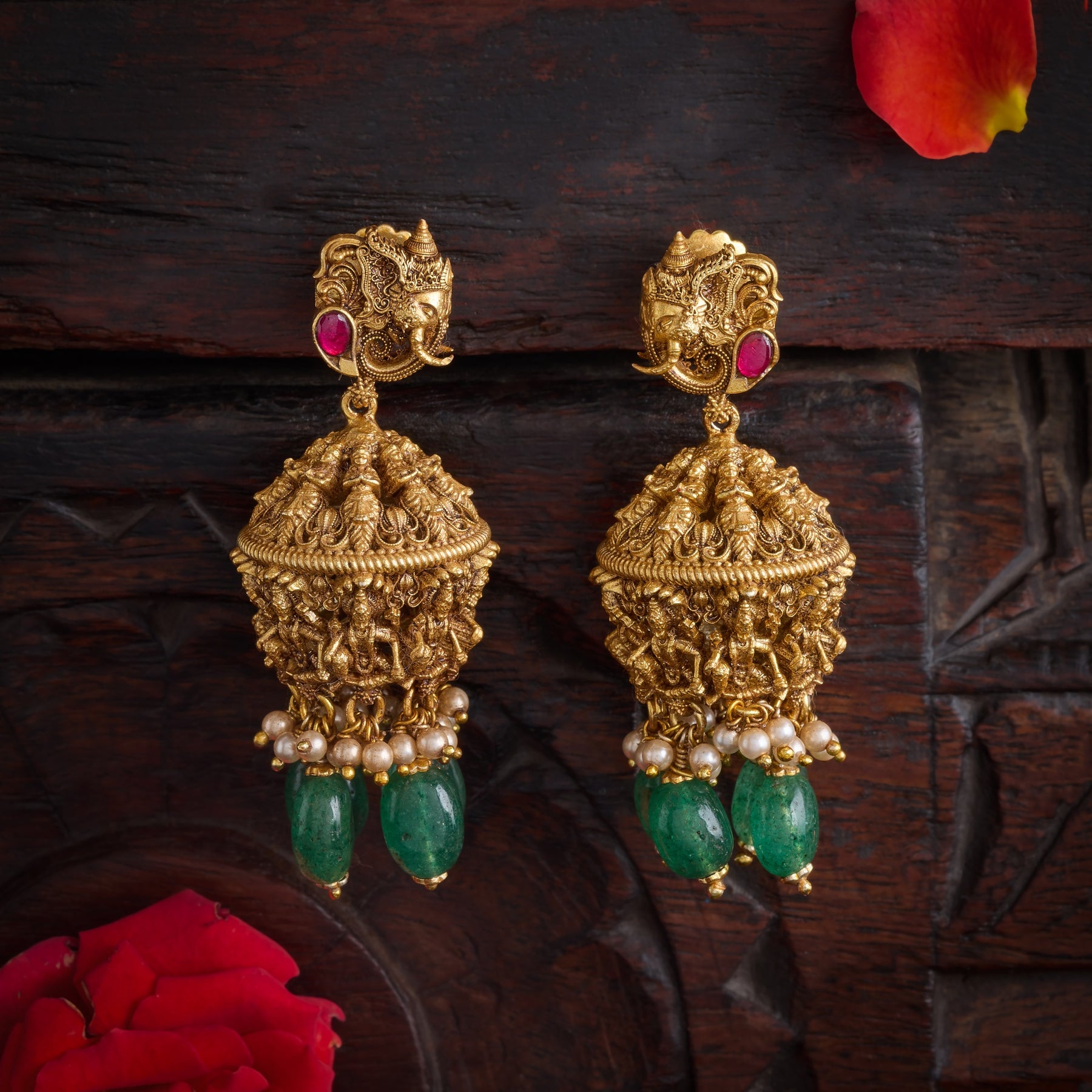 Shree Vaikuntha Jhumki celebrates divine craftsmanship. These earrings feature intricately designed Lakshmi and Vishnu motifs, complemented by a graceful Ganesha centerpiece. Adorned with lustrous Pearls, vibrant Emeralds, and deep red Rubies, each hanging creates a harmonious blend of spiritual symbolism and refined elegance. Perfect for festive occasions and spiritual ceremonies, these jhumki embody traditional artistry with semi precious gemstone embellishments.