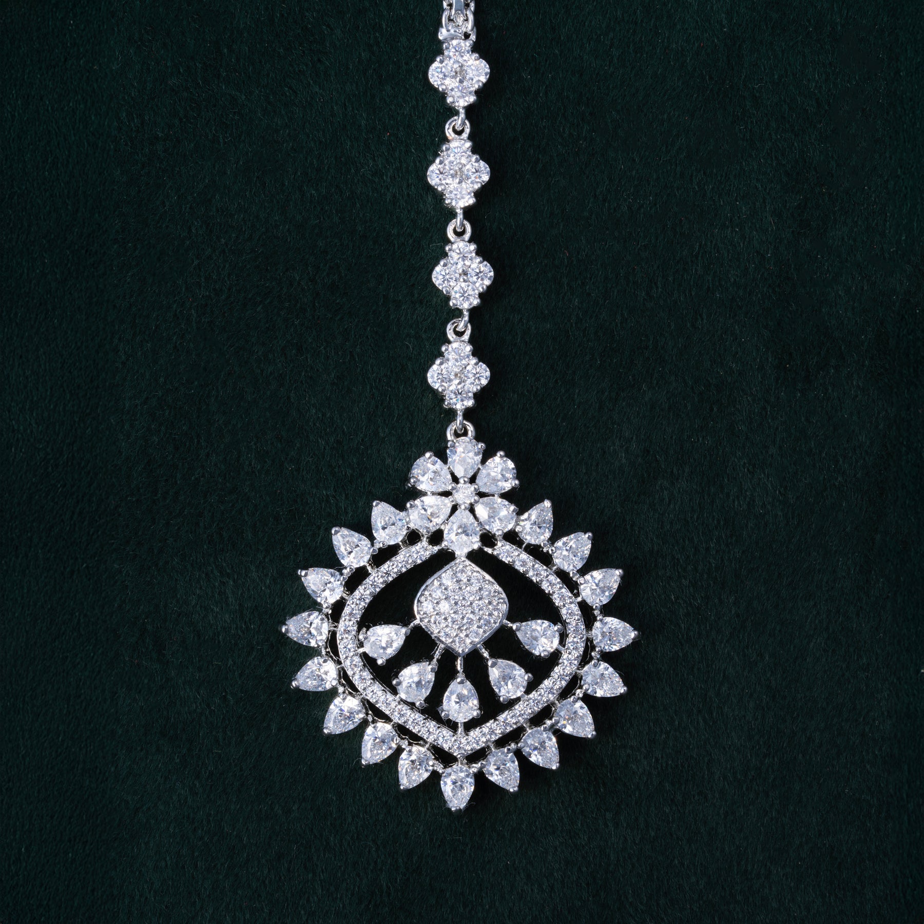 Enhance your traditional look with our Taraasha Maang Tikka. Carefully designed with intricate Floral and Pear Shapes, adorned with sparkling CZ stones that add a touch of elegance. Perfect for any occasion, this Tikka will surely make you stand out in the crowd.