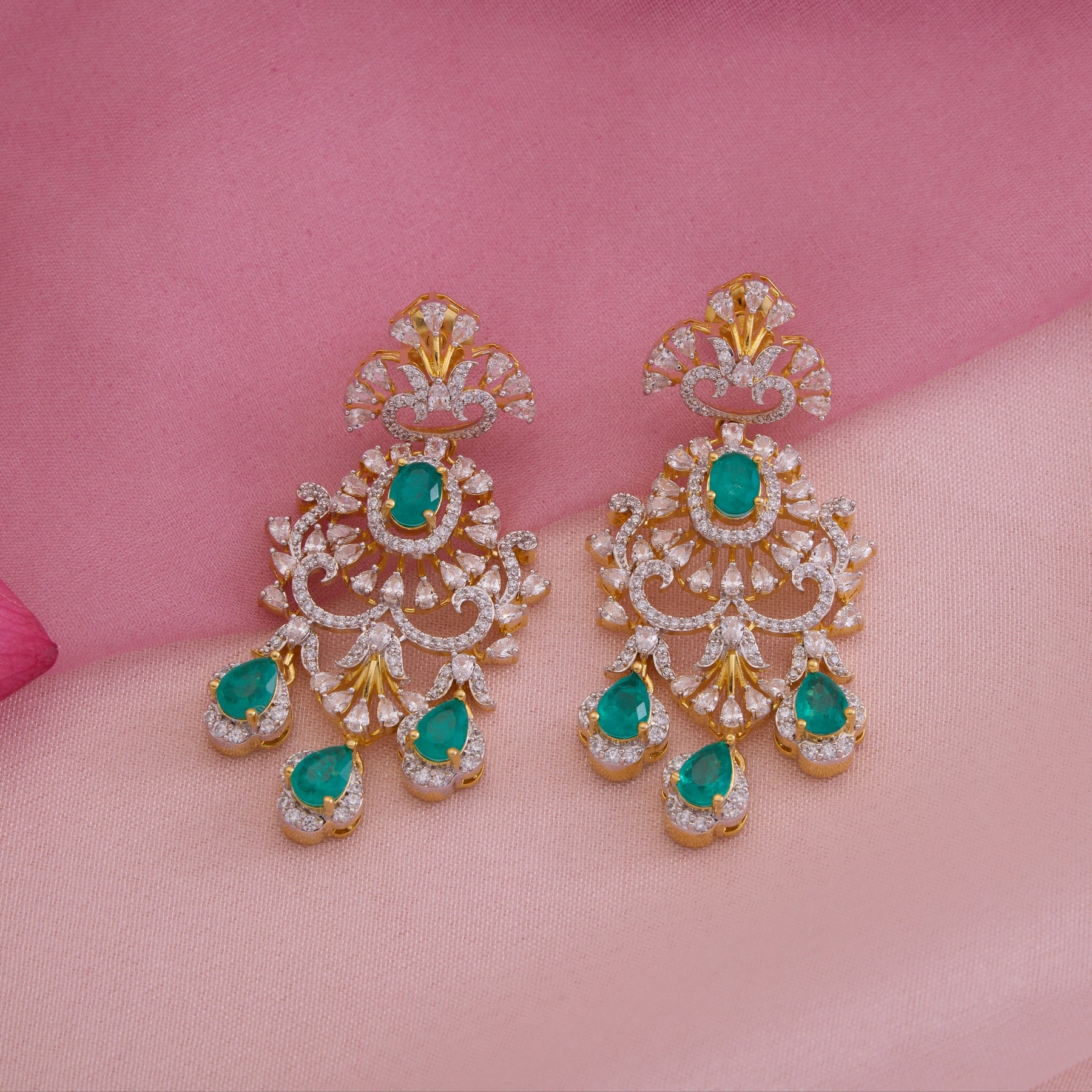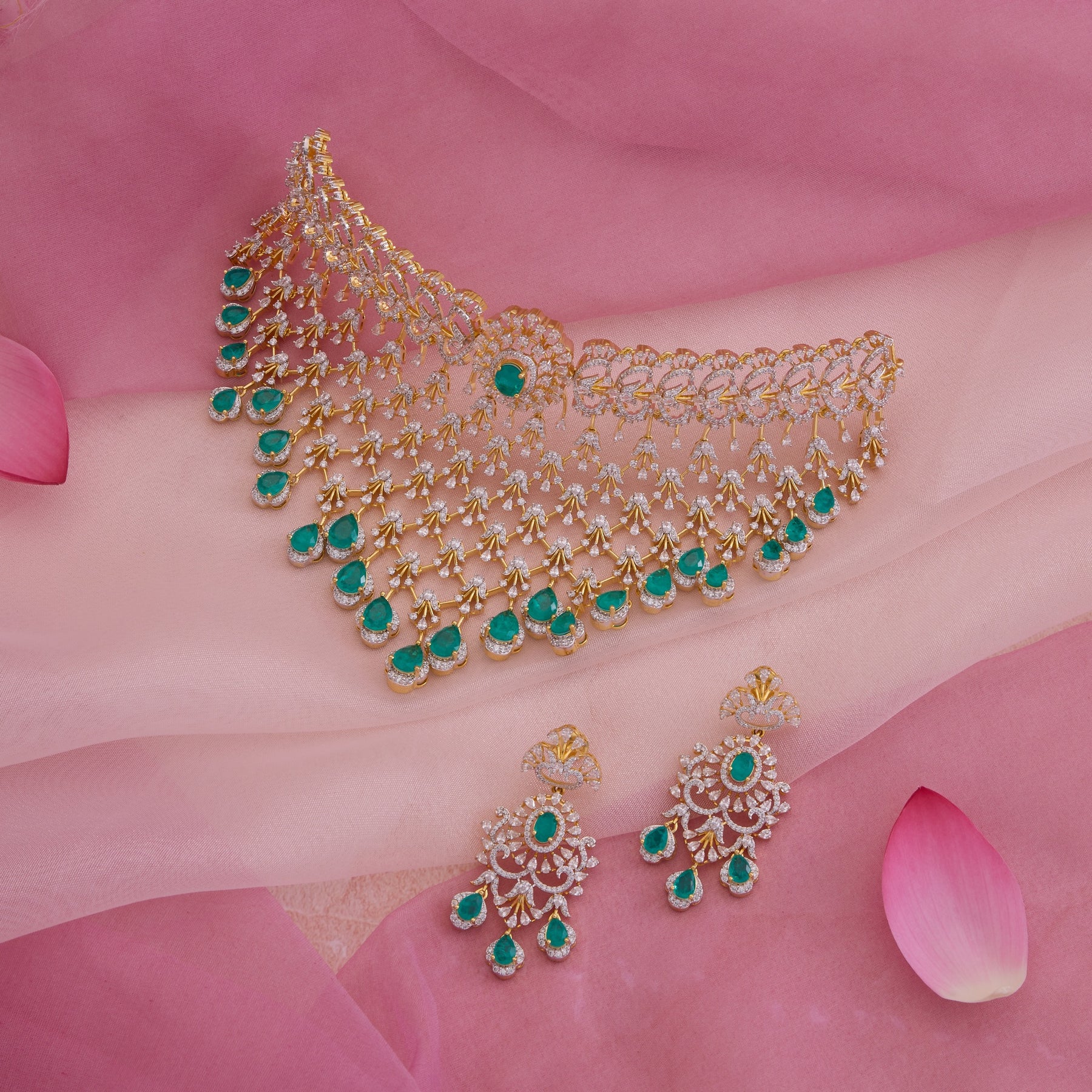 Mint Pearline Choker Set features an elegant Oval-shaped Floral centrepiece adorned with sparkling Cubic Zirconia stones, complemented by graceful Pear-shaped Emerald drops. This sophisticated design combines timeless craftsmanship with contemporary elegance, making it an ideal choice for special occasions wear. The interplay of brilliant CZ accents and rich Emerald hues creates a striking visual depth that elevates any ensemble.
