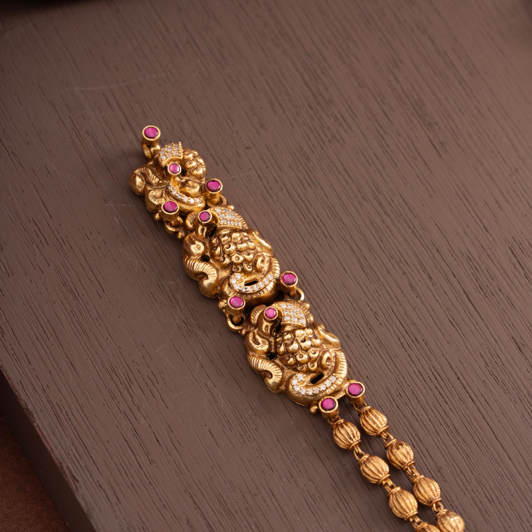 The Kiritin Haaram is an exquisite necklace featuring intricate Peacock motifs, enhanced with vibrant Rubies, traditional Kundan, and sparkling CZ stones. Delicately adorned with Green and Pink Bead hangings, this piece combines classic craftsmanship with colourful elegance, making it a standout accessory for special occasions.