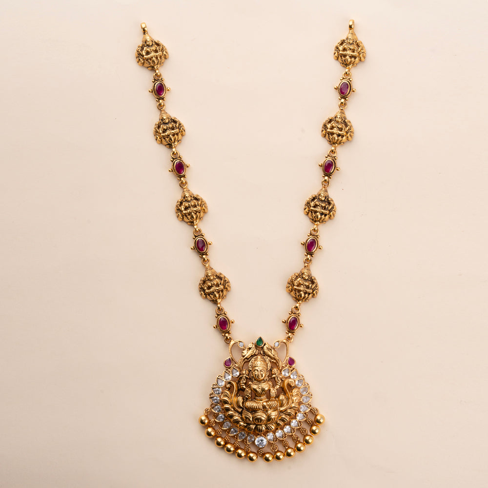 This Nityashree Mayura Short Necklace showcases intricate designs of Lakshmi and Peacock motifs, adorned with Pear and Oval Shaped Rubies, Emerald, and CZ stones, along with Golden Beads. Elevate your style with this beautiful piece that combines traditional elements with a touch of elegance.