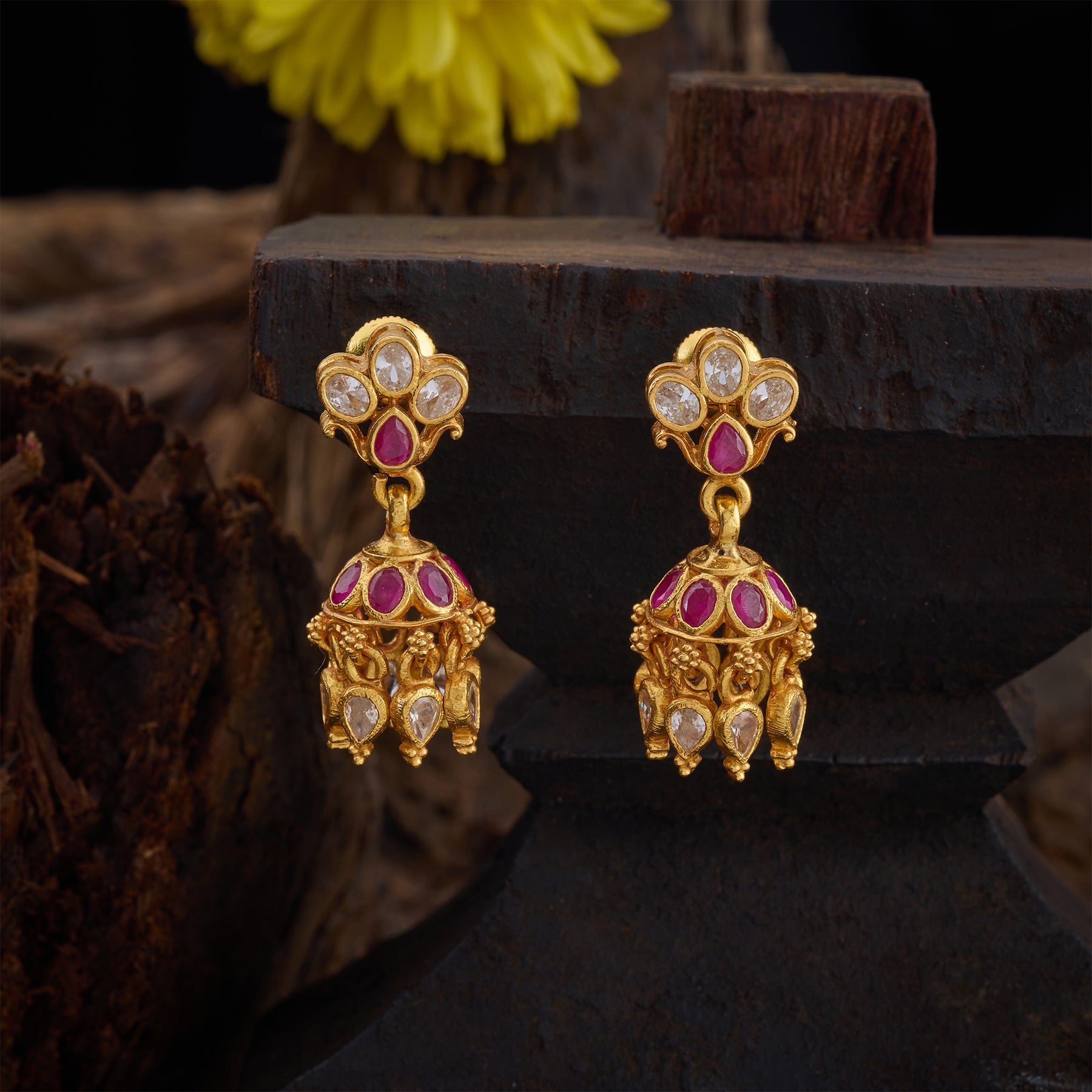 The Rosiraaga Jhumki showcases expert craftsmanship with its intricate Floral design, elegantly adorned with vibrant Rubies and sparkling Cubic Zirconia stones. This exquisite combination enhances its traditional charm while offering a refined sparkle, making it a perfect accessory for special occasions.