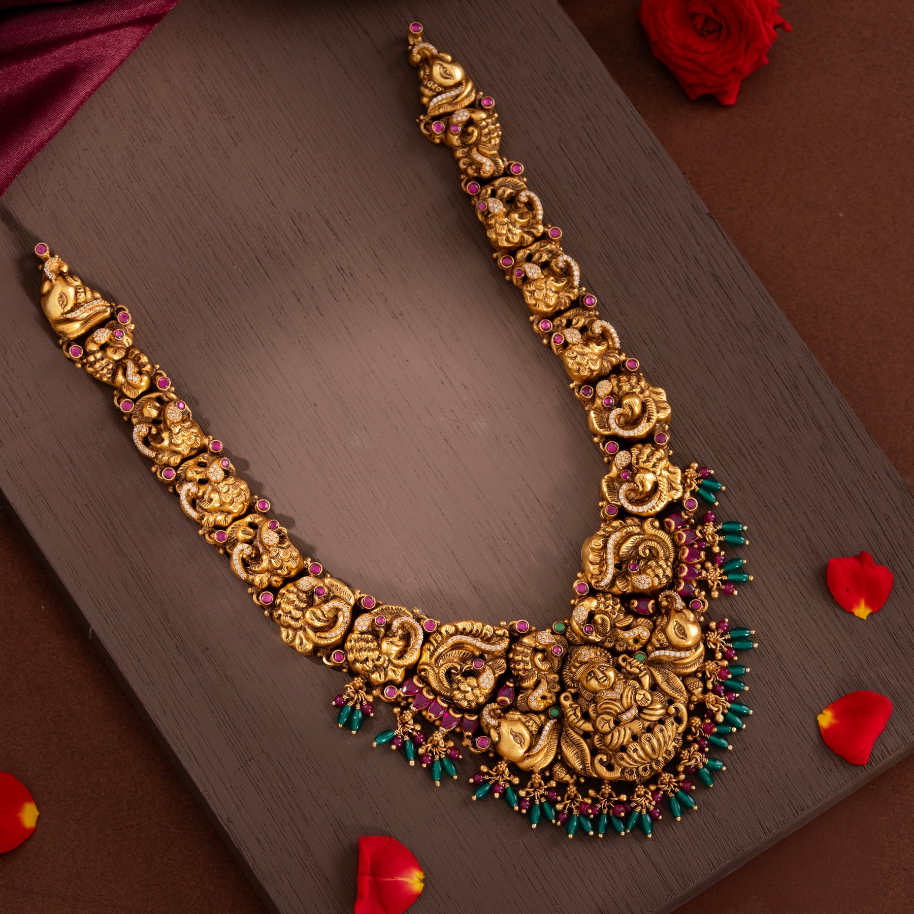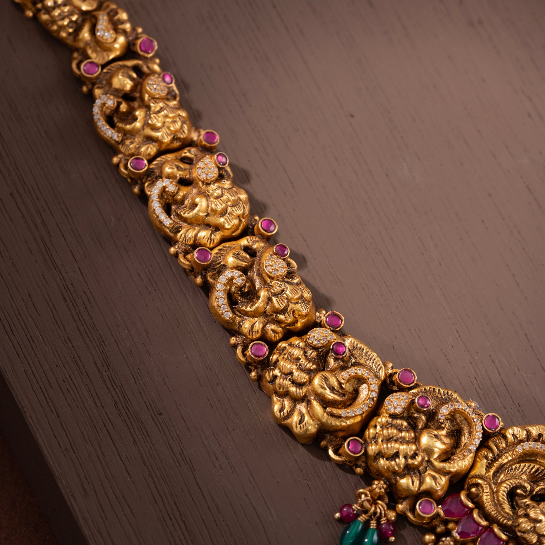 Elevate your traditional collection with the Vimalashree Haaram, exquisitely crafted to feature intricate Peacock and Lakshmi motifs. This statement piece showcases a harmonious blend of Kundan, Rubies, and CZ stones, enhancing its regal charm. The necklace is further adorned with graceful hangings of Green and Pink beads, adding vibrant colour and a touch of elegance. Perfect for special occasions, this artisan-crafted haaram reflects expert craftsmanship and cultural richness.