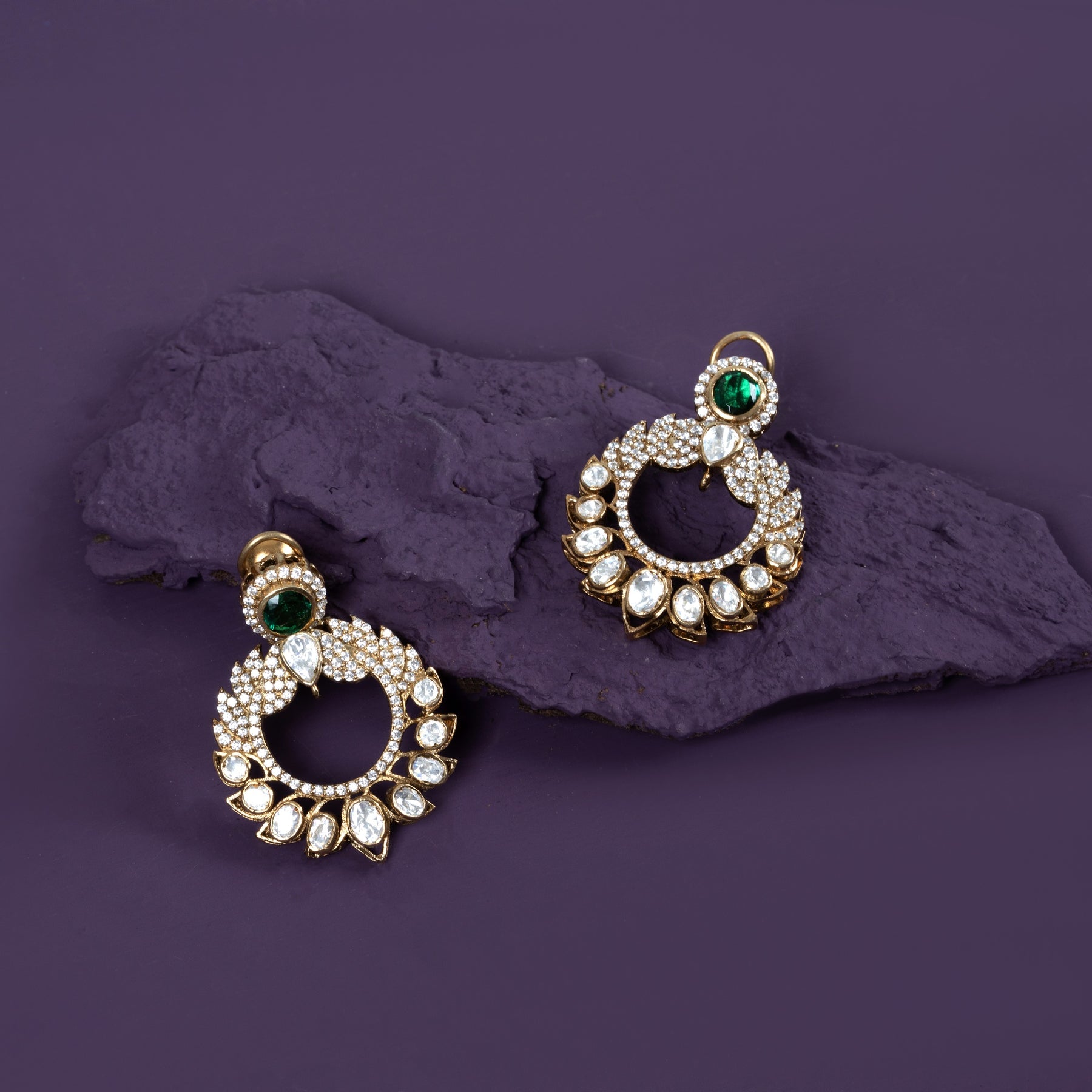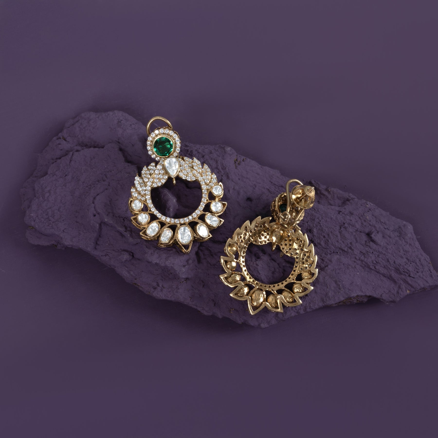 Elevate your ensemble with the Regalia Verde Danglers, expertly crafted with shimmering Moissanites, dazzling Cubic Zirconia stones, and a vibrant Emerald centrepiece. These earrings blend brilliance and rich colour, offering a refined sparkle that enhances any occasion with timeless elegance and expert sophistication.
