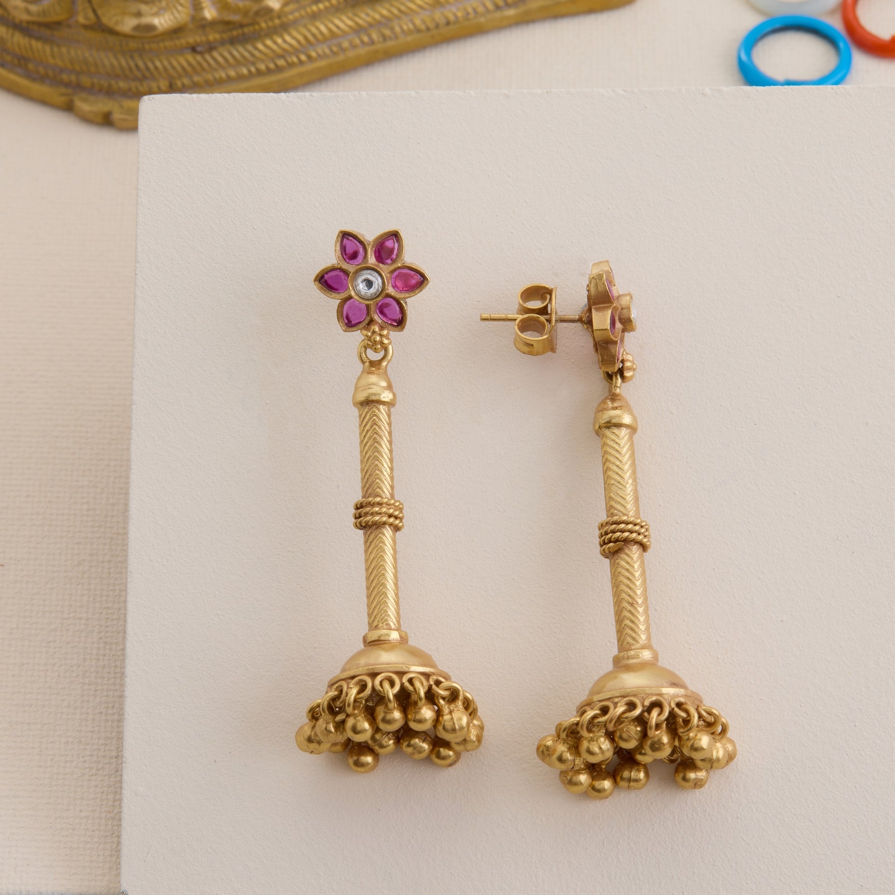 Crafted with exquisite Floral motifs, these Tulip Fall Danglers showcase intricate Kundan work accented by lustrous Pearls and shimmering Golden beads. The combination creates a refined elegance perfect for enhancing traditional and contemporary looks with a touch of timeless beauty.