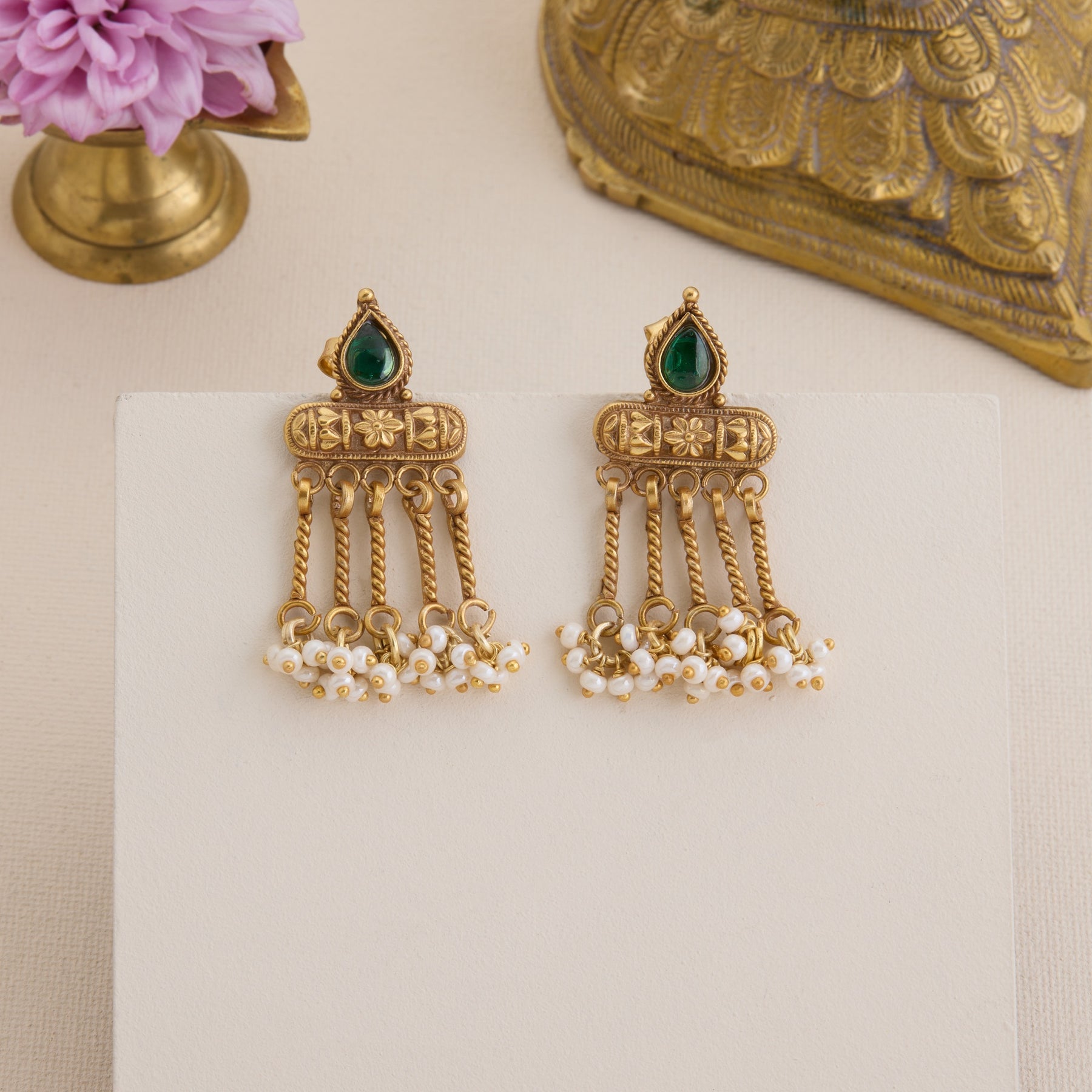These Hariyali Pearls Danglers feature a meticulously crafted Pear-Shaped Emerald, complemented by delicate Pearl Drops. The combination highlights refined elegance while adding a sophisticated touch to any ensemble. Perfect for occasions that demand understated luxury, these earrings blend timeless design with expert craftsmanship.