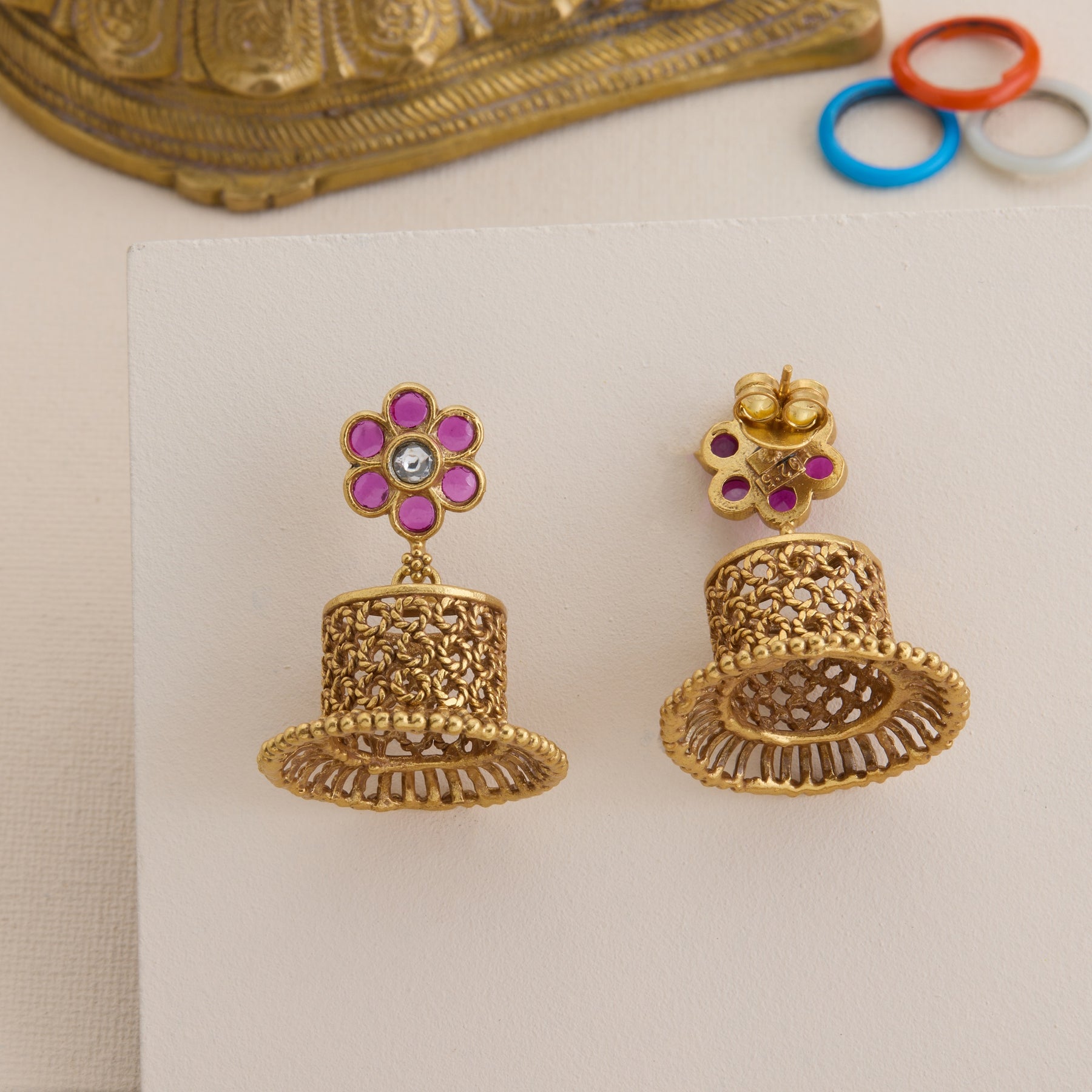 The Laal Phoolwari Danglers feature an exquisite Floral design richly adorned with vibrant Rubies. This expertly crafted piece captures the essence of nature's beauty while adding a touch of sophisticated colour, creating a statement accessory ideal for elegant occasions.