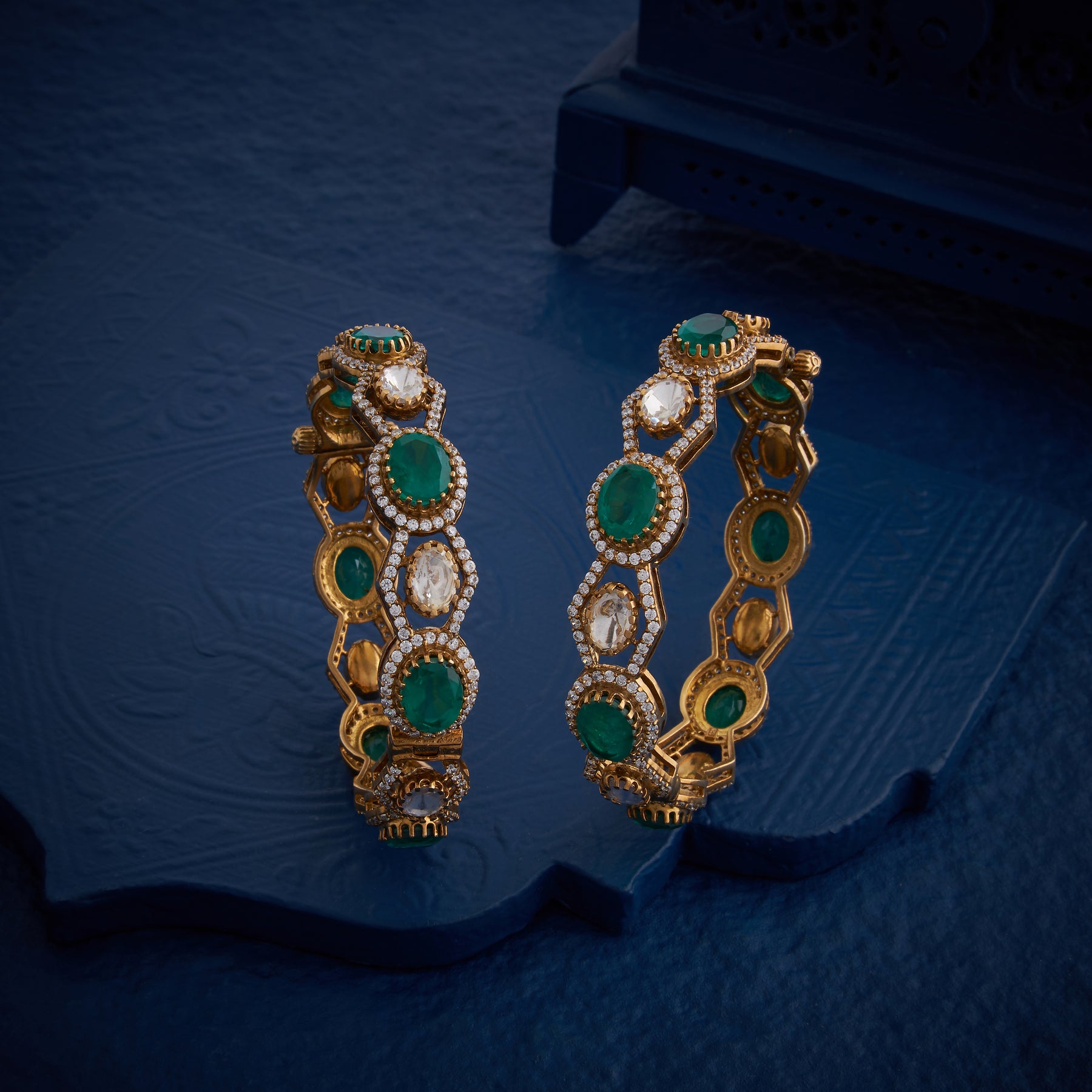 The Jewel of Eden Bangles are elegantly designed featuring dazzling emeralds accented with sparkling Cubic Zirconia stones. This expert craftsmanship highlights the rich green hues of the emeralds, enhanced by the brilliance of finely cut CZ stones, creating a sophisticated accessory that complements both traditional and contemporary styles. These bangles offer a refined blend of luxury and versatility for any occasion.