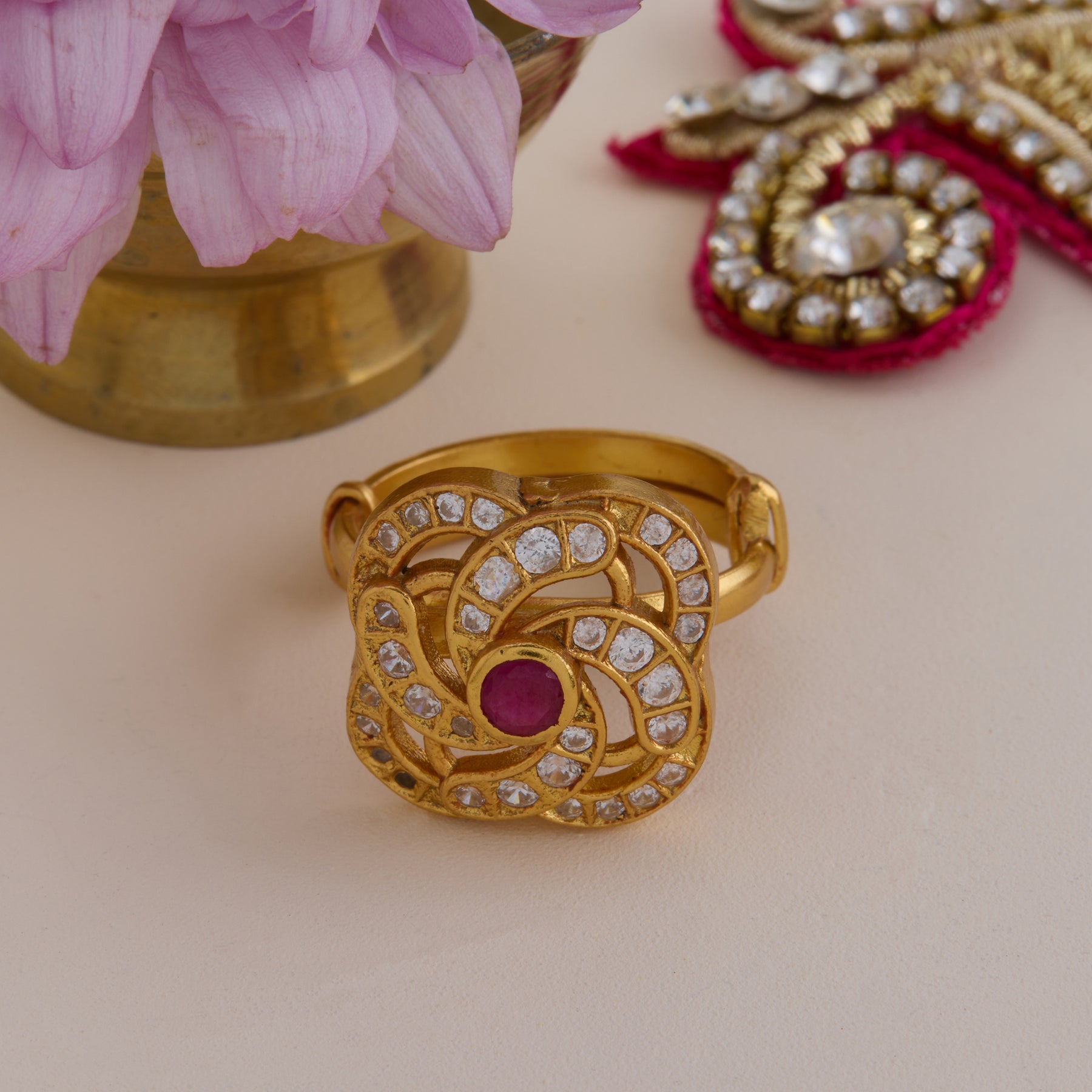 The Roohgul Ring showcases expert craftsmanship, featuring an elegant Rose design adorned with sparkling CZ stones. At its heart sits a vibrant Ruby, adding a touch of refined luxury and symbolic passion. This ring seamlessly blends classic beauty with meticulous detail, perfect for those who appreciate artistry in jewellery.
